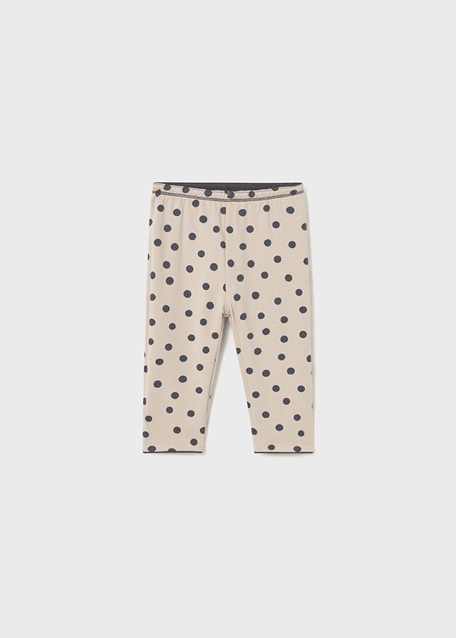 Camiseta de manga ranglán para bebé. Cuello redondo. Cierre con botones a presión en la parte posterior. Elementos de adorno: bordado. Pantalón tipo legging para bebé. Cinturilla elástica. Suave tejido de algodón elástico. Estampado de lunares. Este modelo presenta un diseño reversible.