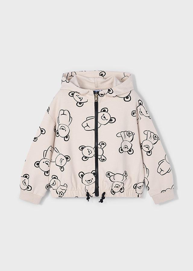 Sudadera de manga larga para niña. Cuello con capucha. Cierre central delantero con cremallera. Diseño con cordón regulable en el bajo para un mejor ajuste al cuerpo. Elementos de adorno: serigrafía (print).