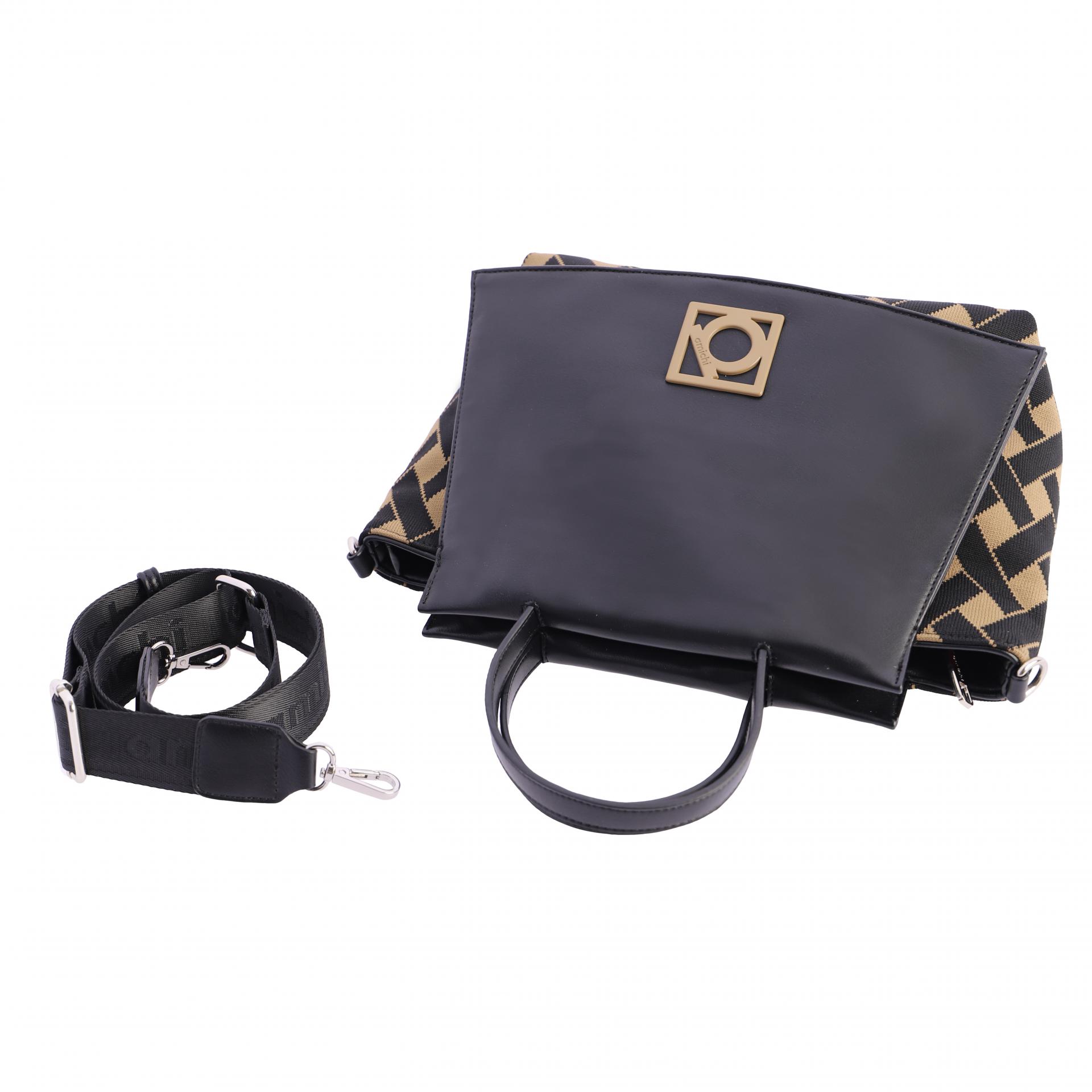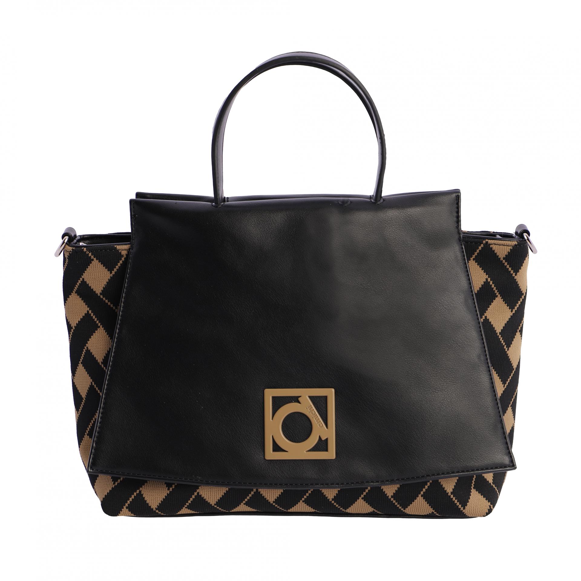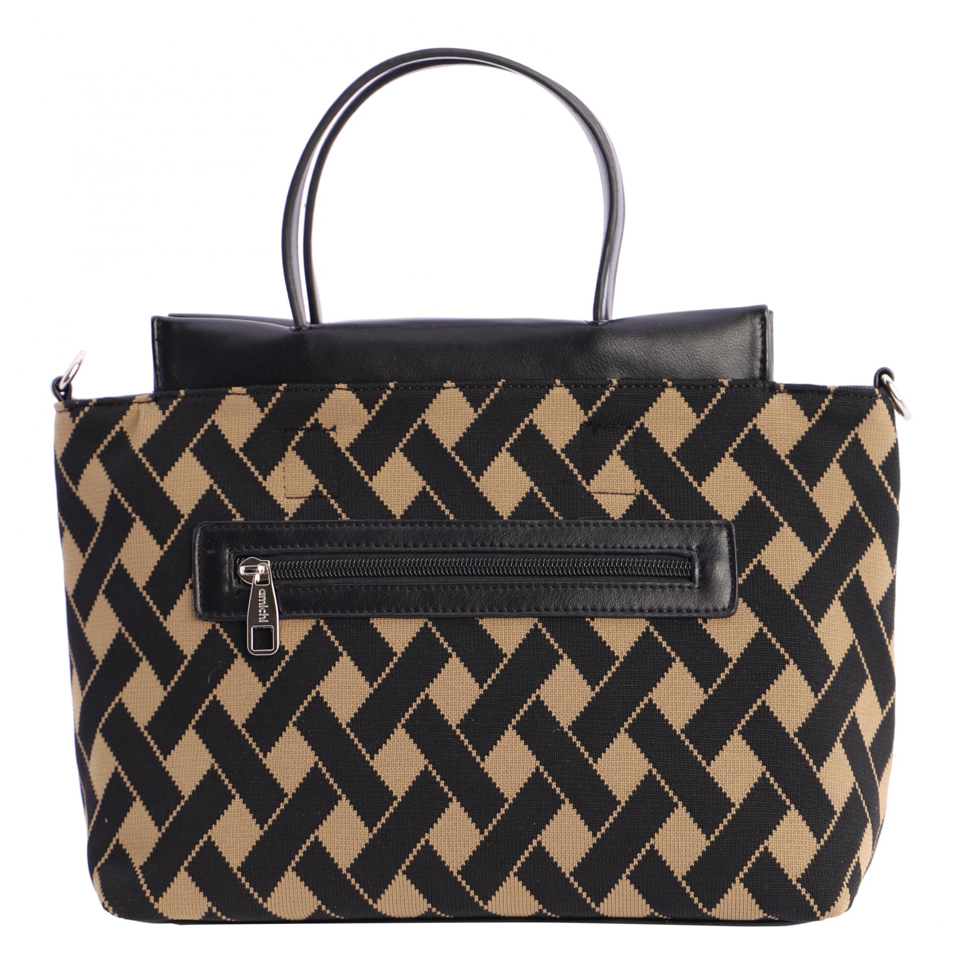 Bolso de mano para mujer Amichi Uxue de piel sintética y tejido. LLeva otra asa bandolera, ancha ajustable y extraíble logotipada de nailon. Tiene cierre de cremallera, dispone de tres bolsillos interiores, dos delante y uno detrás también con cremallera.