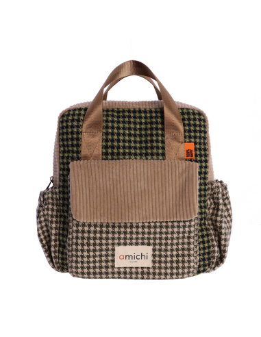 Bolso mochila para mujer Amichi Malva con tejidos en piezas diferentes, tipo pana y pata de gallo. Tiene cierre de cremallera, dispone de tres bolsillos interiores, dos delante y uno detrás también con cremallera, lleva dos bolsillos laterales, y frontal de gran capacidad más otro detrás también con cremallera.