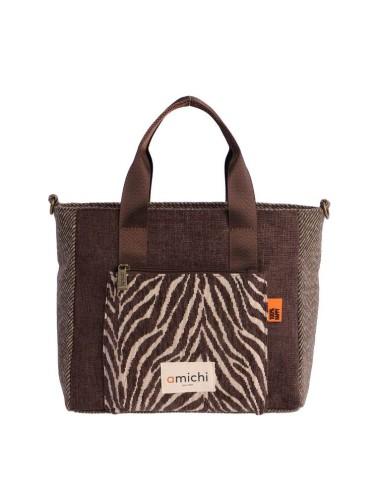 Bolso mano para mujer Amichi Sania de tejidos de diferentes estampados, liso con textura y cebra. Lleva un asa bandolera ajustable y extraible. Tiene cierre de cremallera con tirador metálico con logo, dispone de tres bolsillos interiores, dos delante y uno detrás.