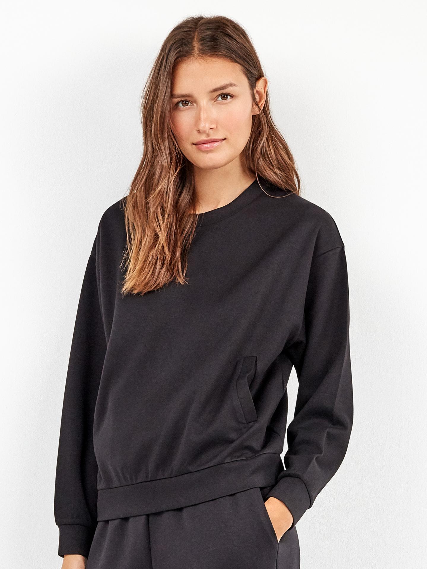 Sudadera crop con bolsillos frontales y mangas largas acabadas en puño. En materia de tacto suave y ligero en el exterior de la prenda. Diseño oversize.