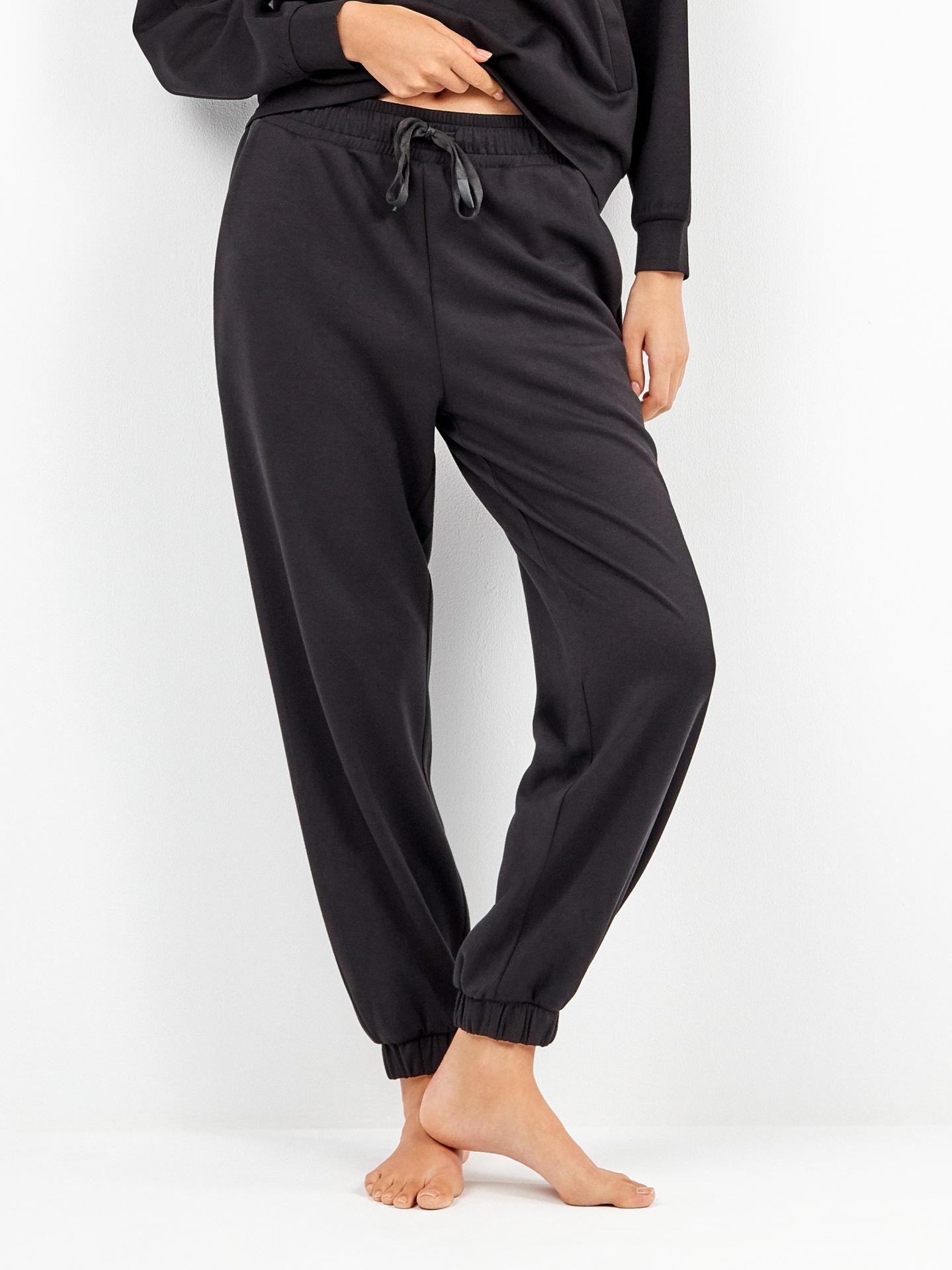 Pantalón largo tipo jogger, goma en los puños que hace efecto abullonado y cintura ajustable con cordón. Confeccionado en materia soft touch, un material ligero y suave en el exterior.