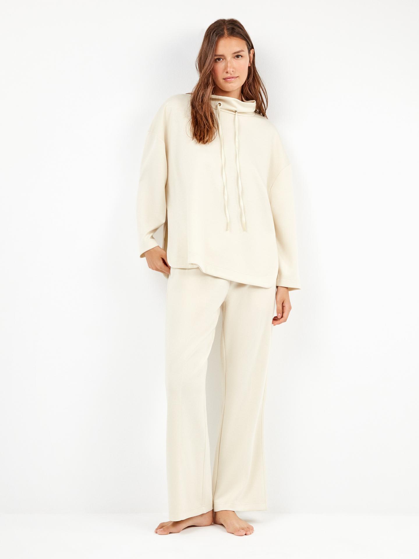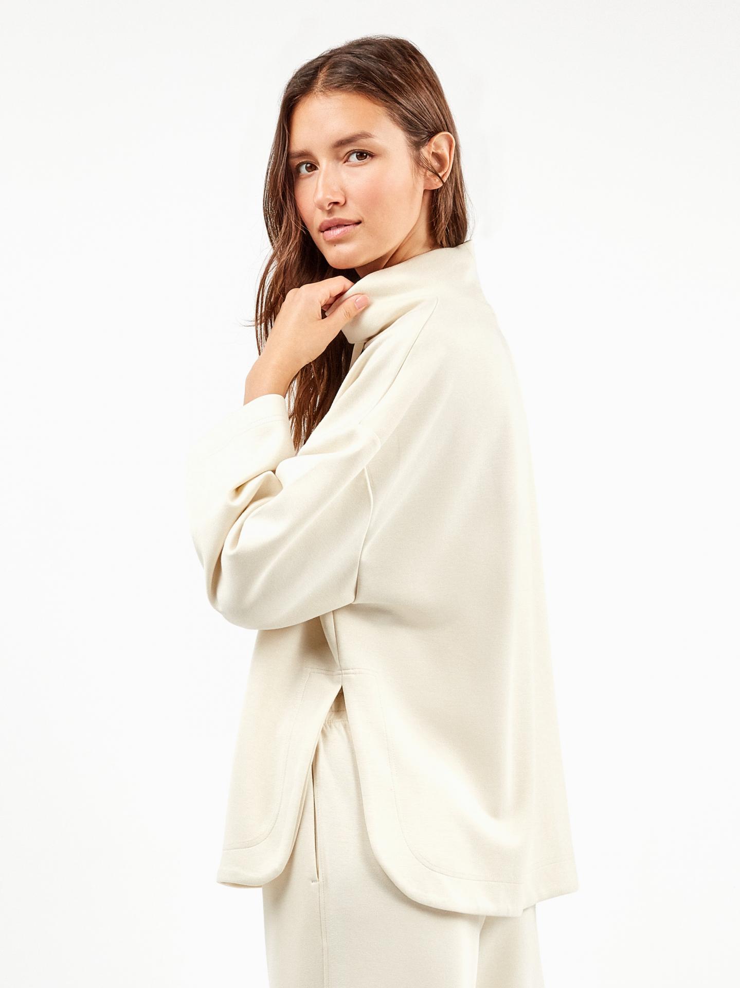 Sudadera oversize de manga larga y aperturas en los laterales, cuello chimenea con cordones de terminaciones enceradas.