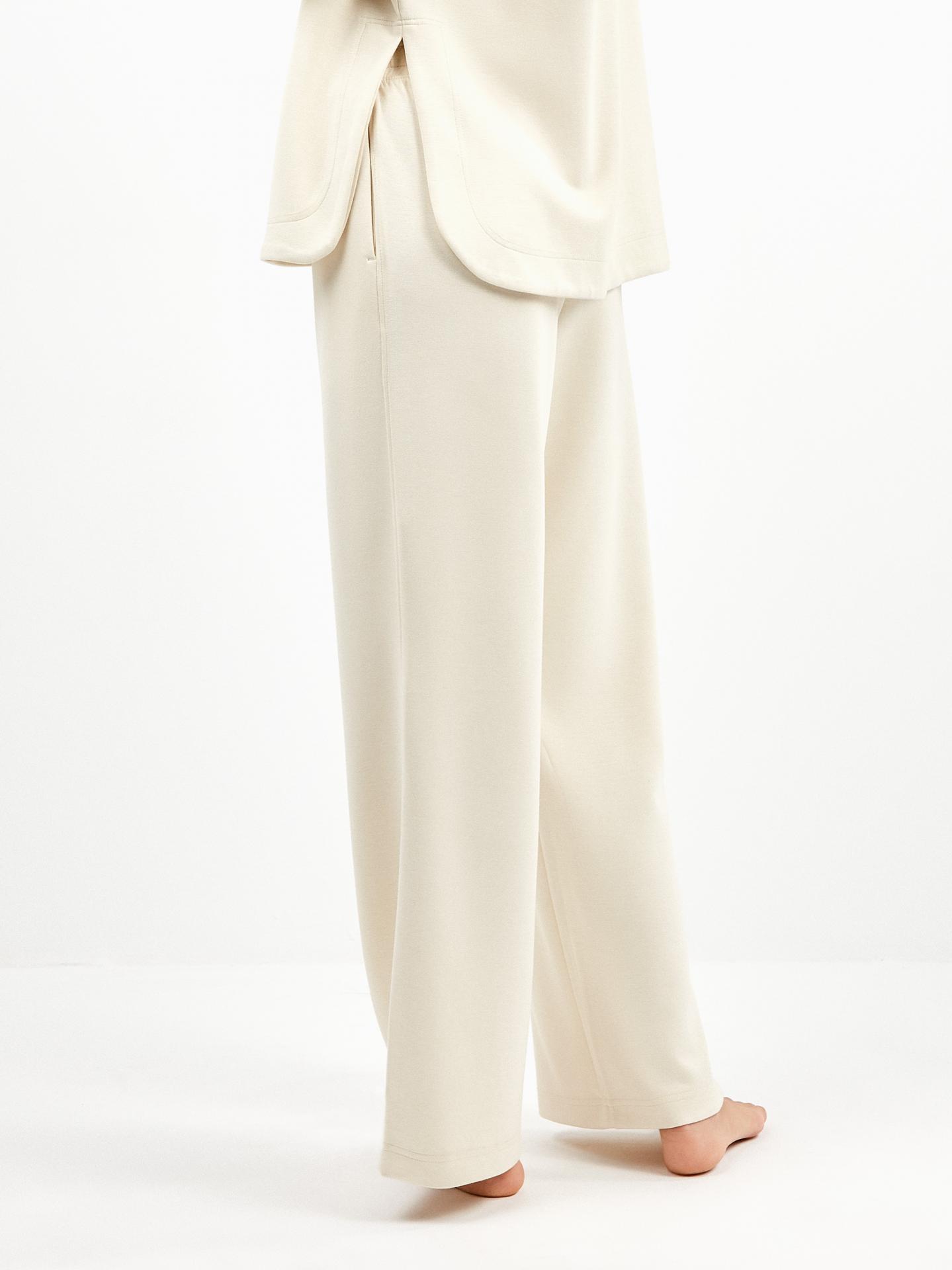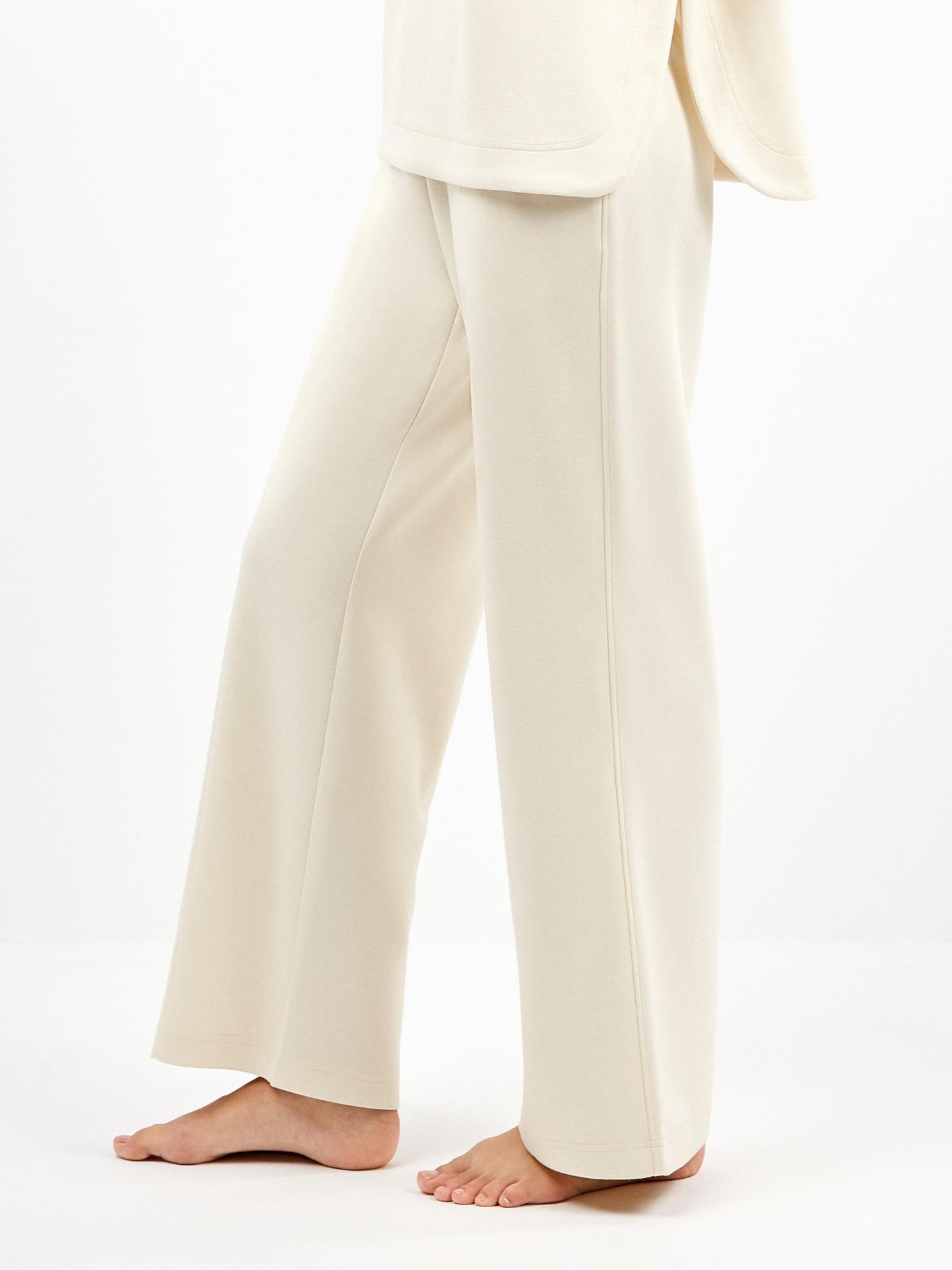 Pantalón largo de pata ancha con detalle de costura frontal y pinzas en la parte trasera para estilizar.