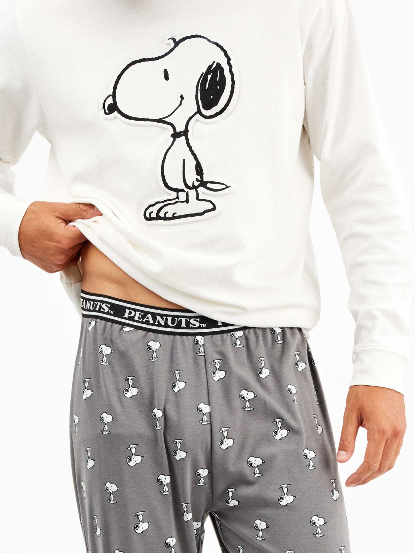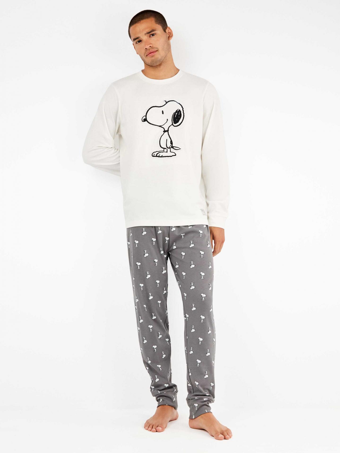 Conjunto pijama hombre en punto interlock compuesto por una camiseta con print en relieve Snoopy y pantalón microestampado a juego con detalle elástico personalizado en cintura y puños en bajo.