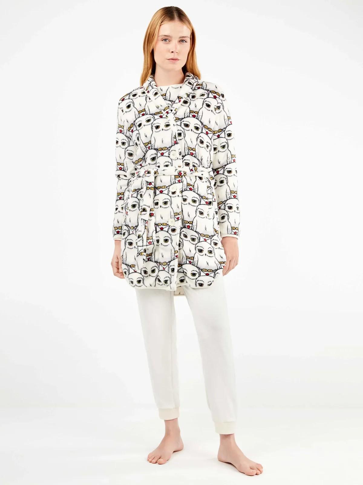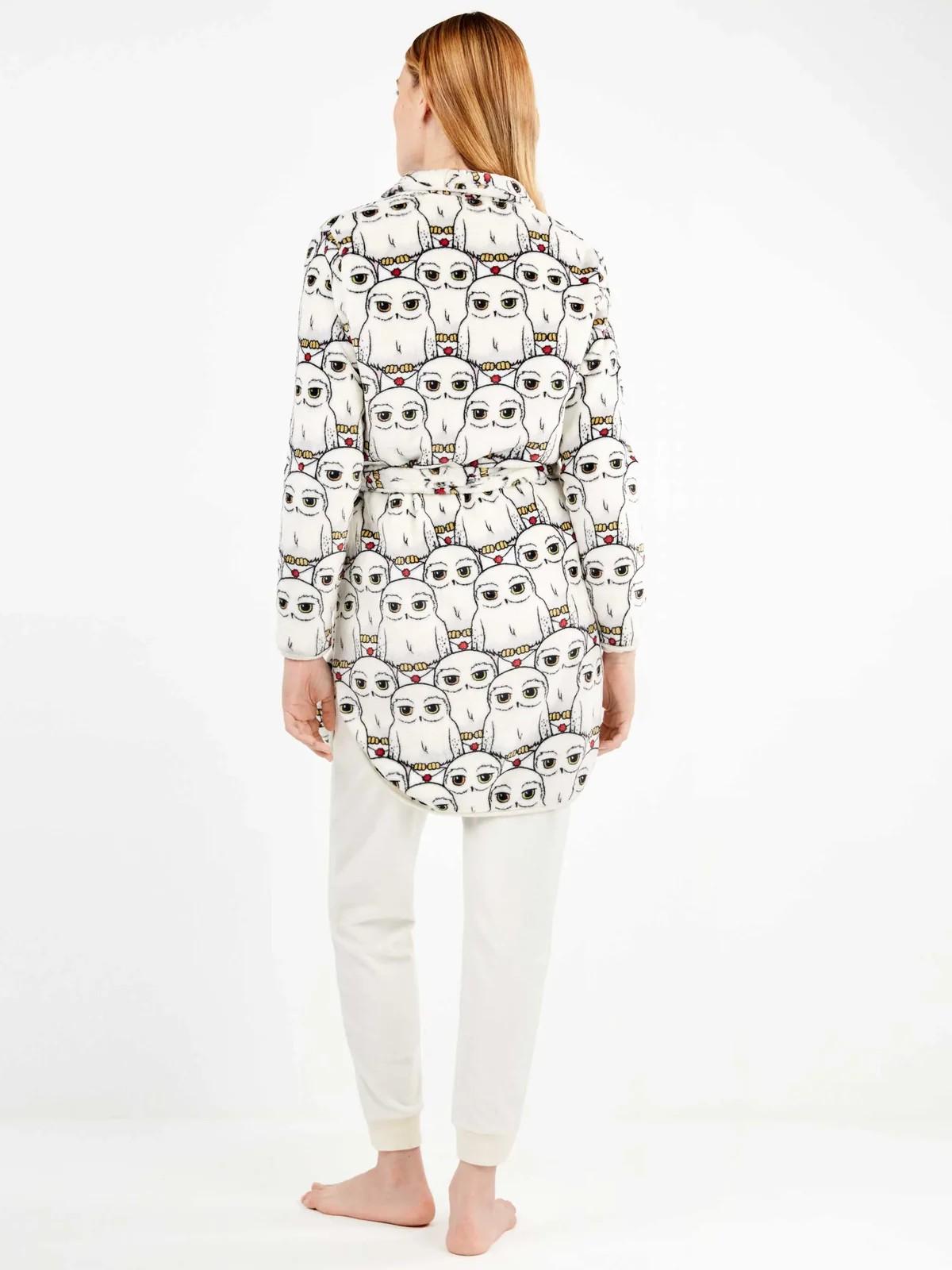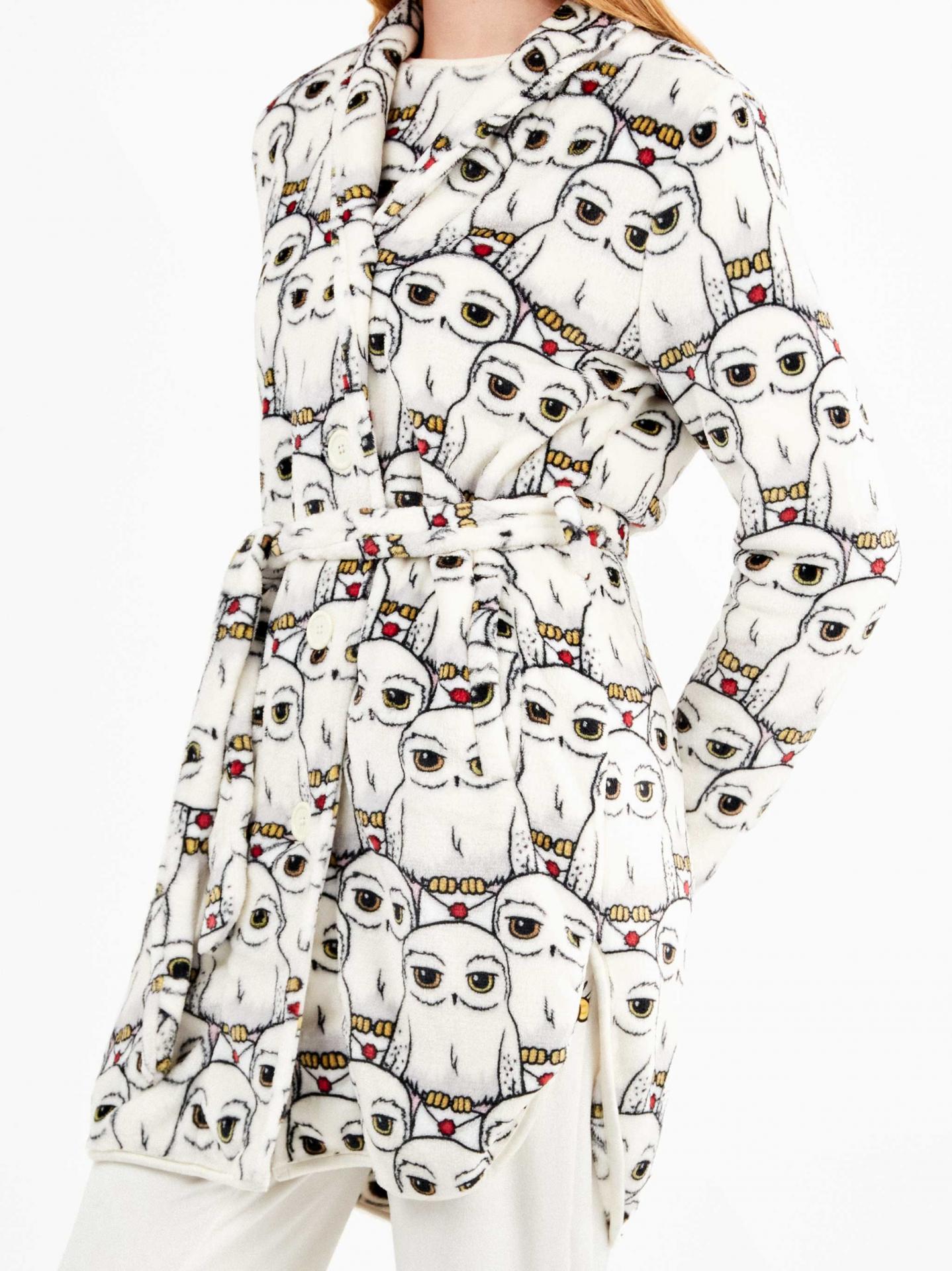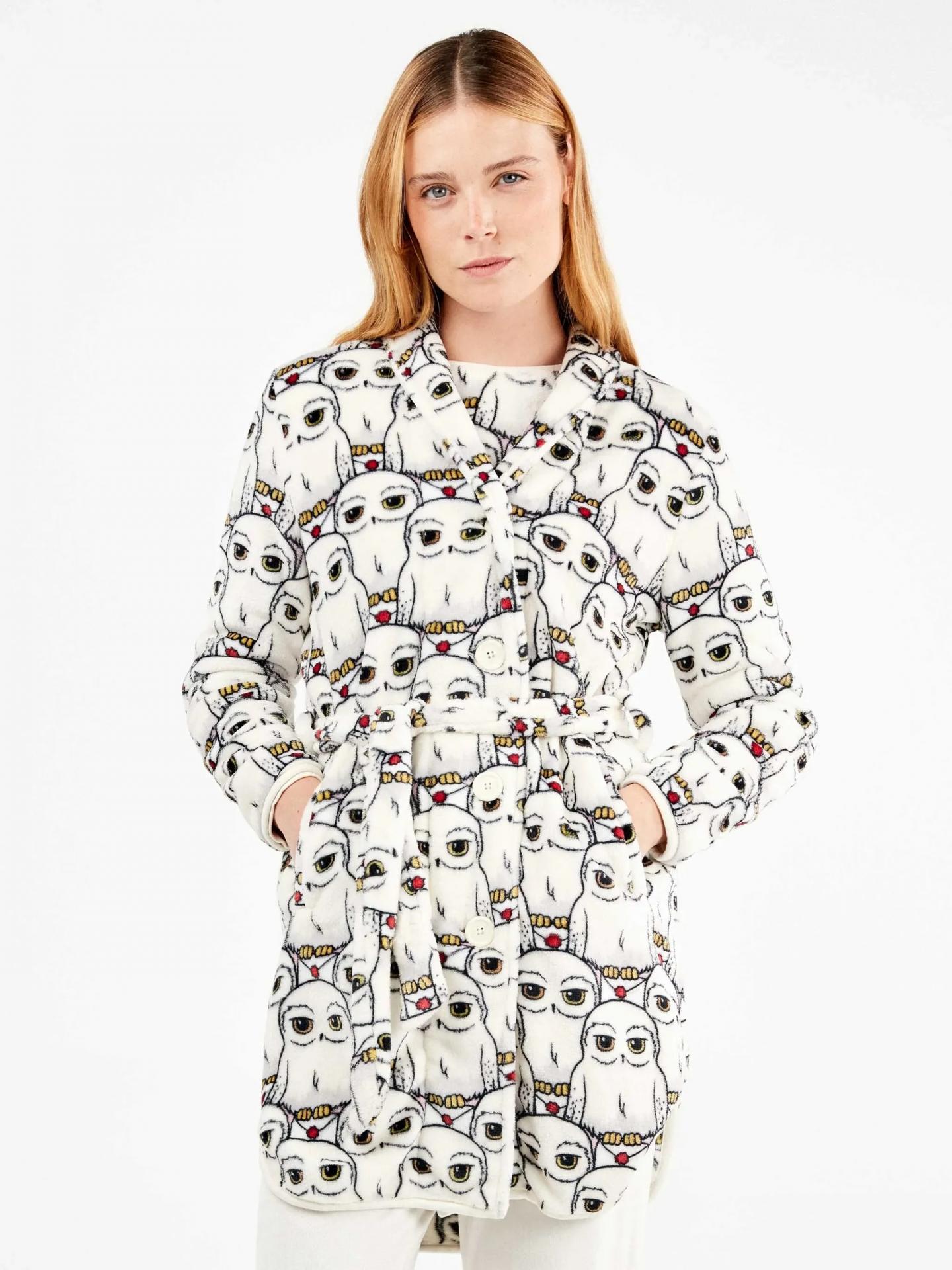 Bata larga con cuello esmoquin en tejido estampado de lechuzas Hedwig en tejido polar elástico. Ajustable en cintura con cinturón.