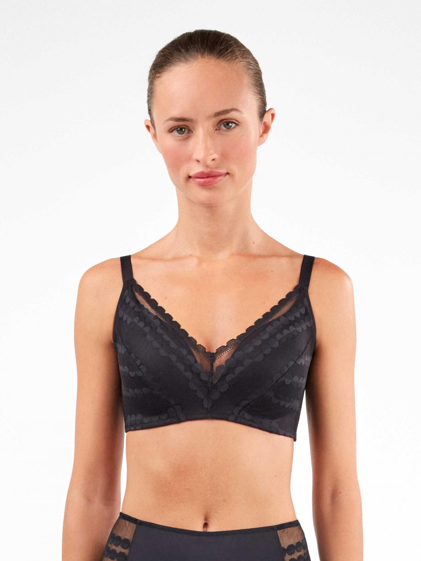 Sujetador de capacidad sin aro y copa de encaje y detalle geométrico. Tirantes de ancho regulable y espaldilla termofusionado sin costuras.
