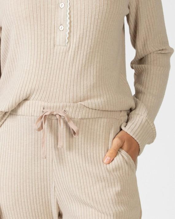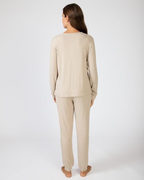 Pijama largo de mujer en tejido desagujado de punto de viscosa. Compuesto de camiseta con cuello redondo y tapeta con botones. Detalle de puntilla. Pantalón largo con bolsillos, cordón y goma en la cintura.