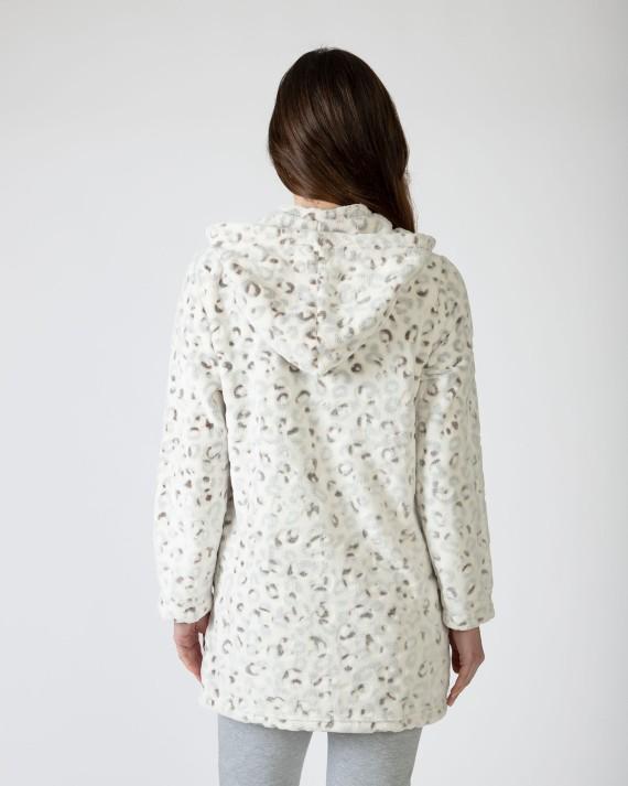 Bata corta de mujer en tejido polar estampado muy suave y cálido. Tiene cremallera para abrochar, capucha extraíble y bolsillos laterales.