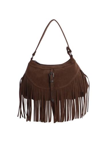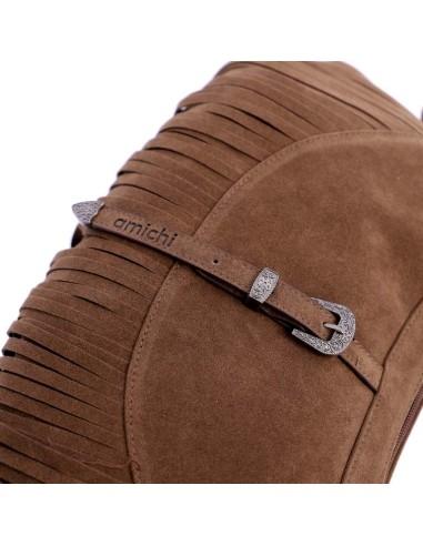 Bolso shopper para mujer Amichi Begonia de antelina con flecos y hebilla decorativa tipo western. Tiene cierre de cremallera, dispone de tres bolsillos interiores, dos delante y uno detrás con cremallera, más otro exterior detrás también con cremallera.