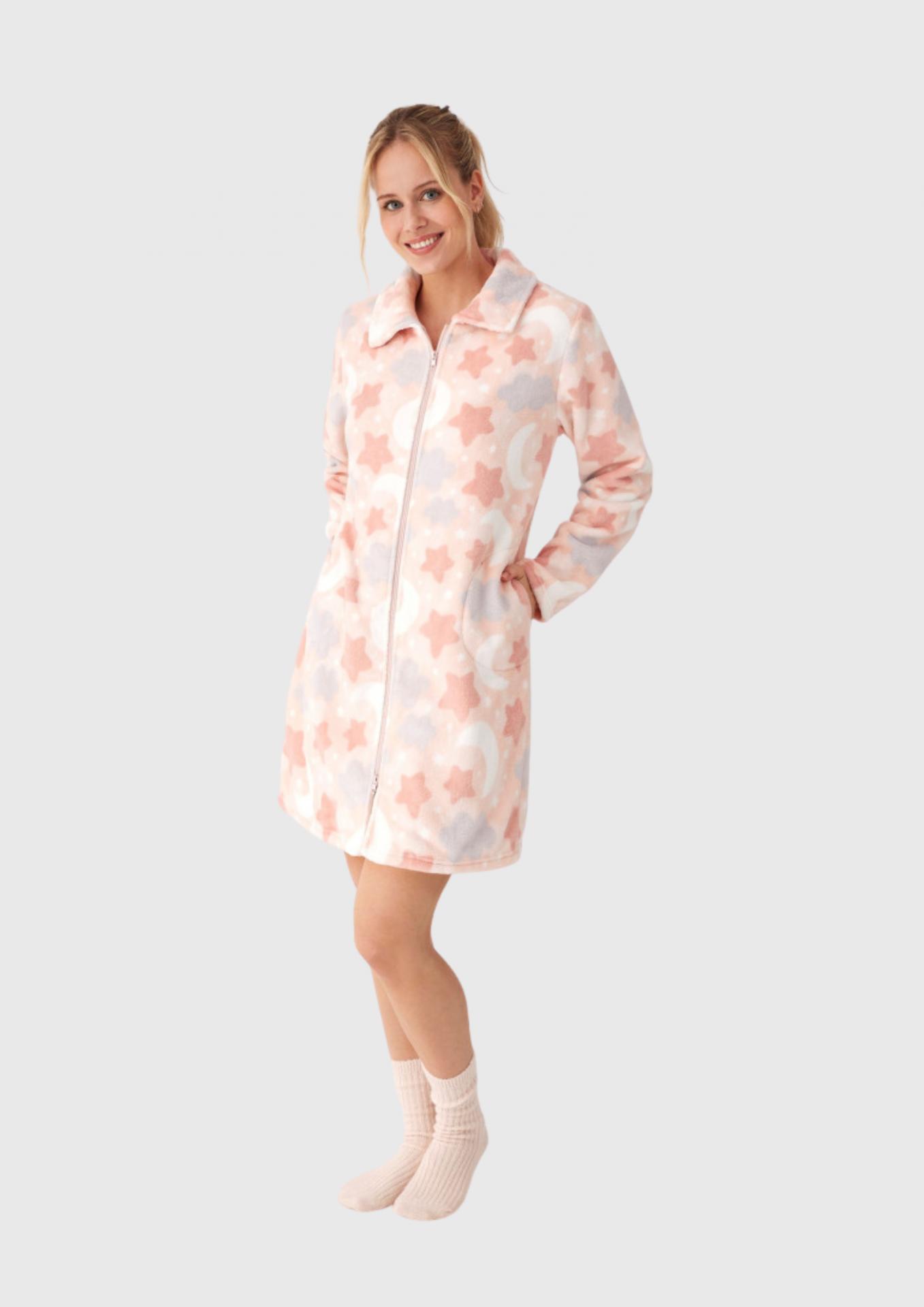 Bata confeccionada en suave tejido tipo coralina con estampado estrellas y lunas sobre fondo color rosa claro. Diseñada para ofrecer el máximo confort, cuenta con cremallera de doble apertura que facilita el movimiento. Incluye prácticos bolsillos laterales.