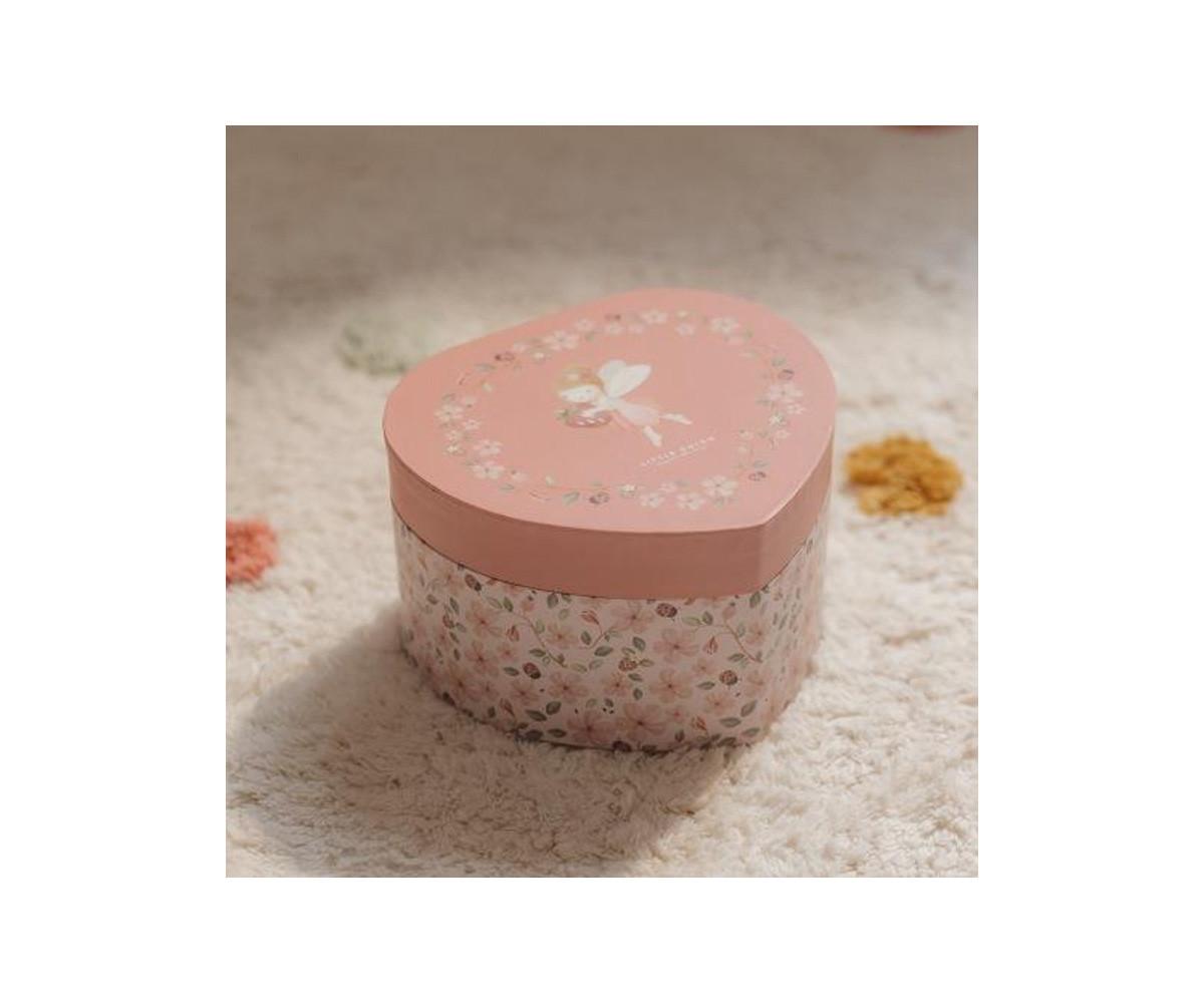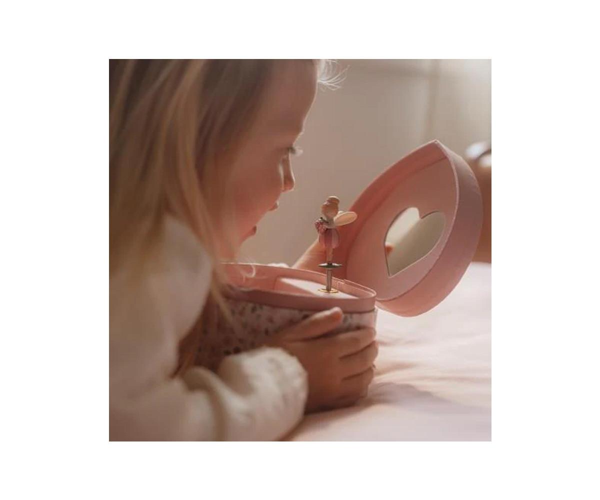 La Caja de Música Joyero de la colección Fairy Garden de Little Dutch es un precioso joyero con forma de corazón, decorado con flores y una encantadora hada. Al abrir la tapa, suena una suave melodía y el hada comienza a girar frente al espejo, creando un momento mágico.