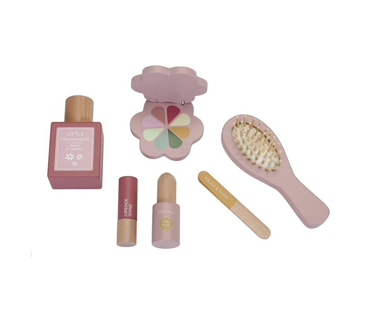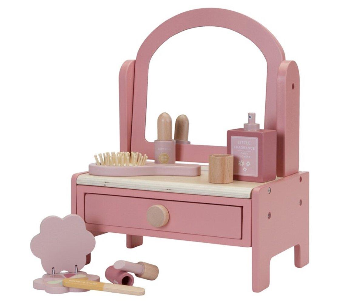 Tocador de madera diseñado para que los niños fomenten el juego imaginativo. El tocador viene con un espejo giratorio e incluye una variedad de productos de belleza para juegos de simulación, un cepillo para el cabello, perfume, lápiz labial, sombra de ojos, lima de uñas y esmalte de uñas. Contiene un cajón de almacenamiento.