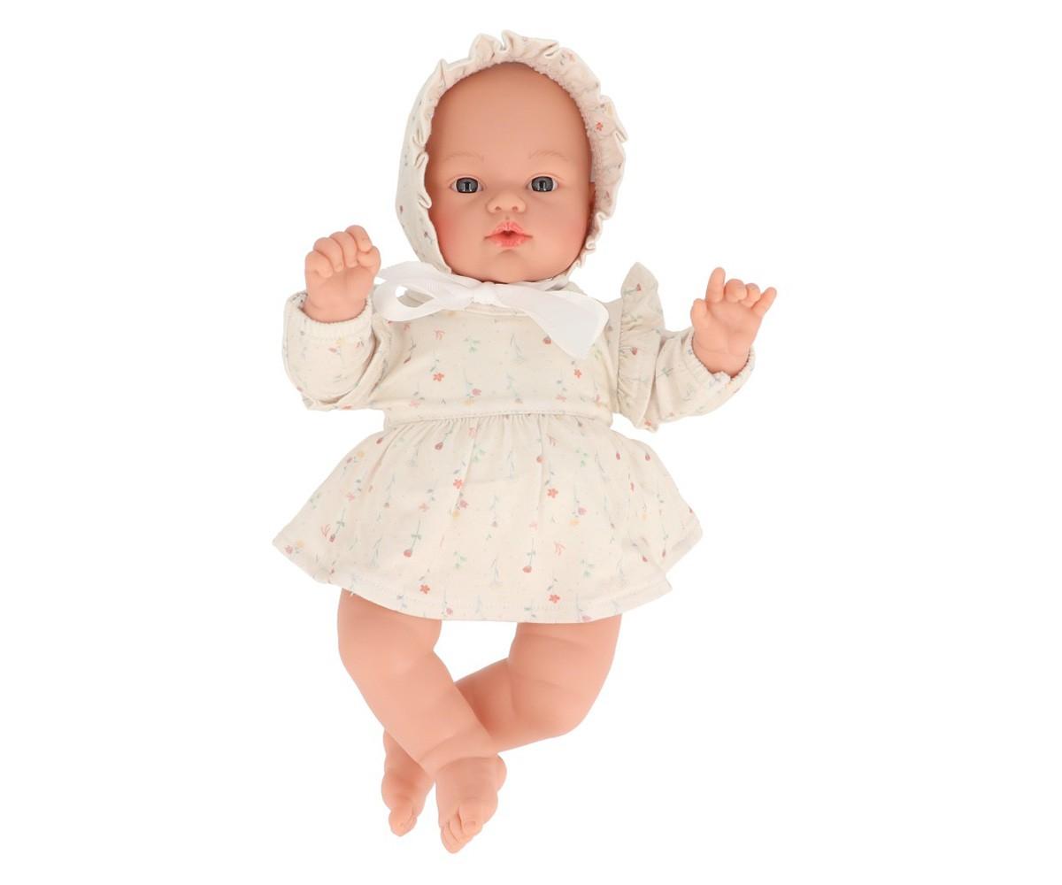 - Incluye: muñeco Koke, ranita colección Flowers, vestido con cierres a presión en la parte trasera y gorro bebé con lazada a conjunto