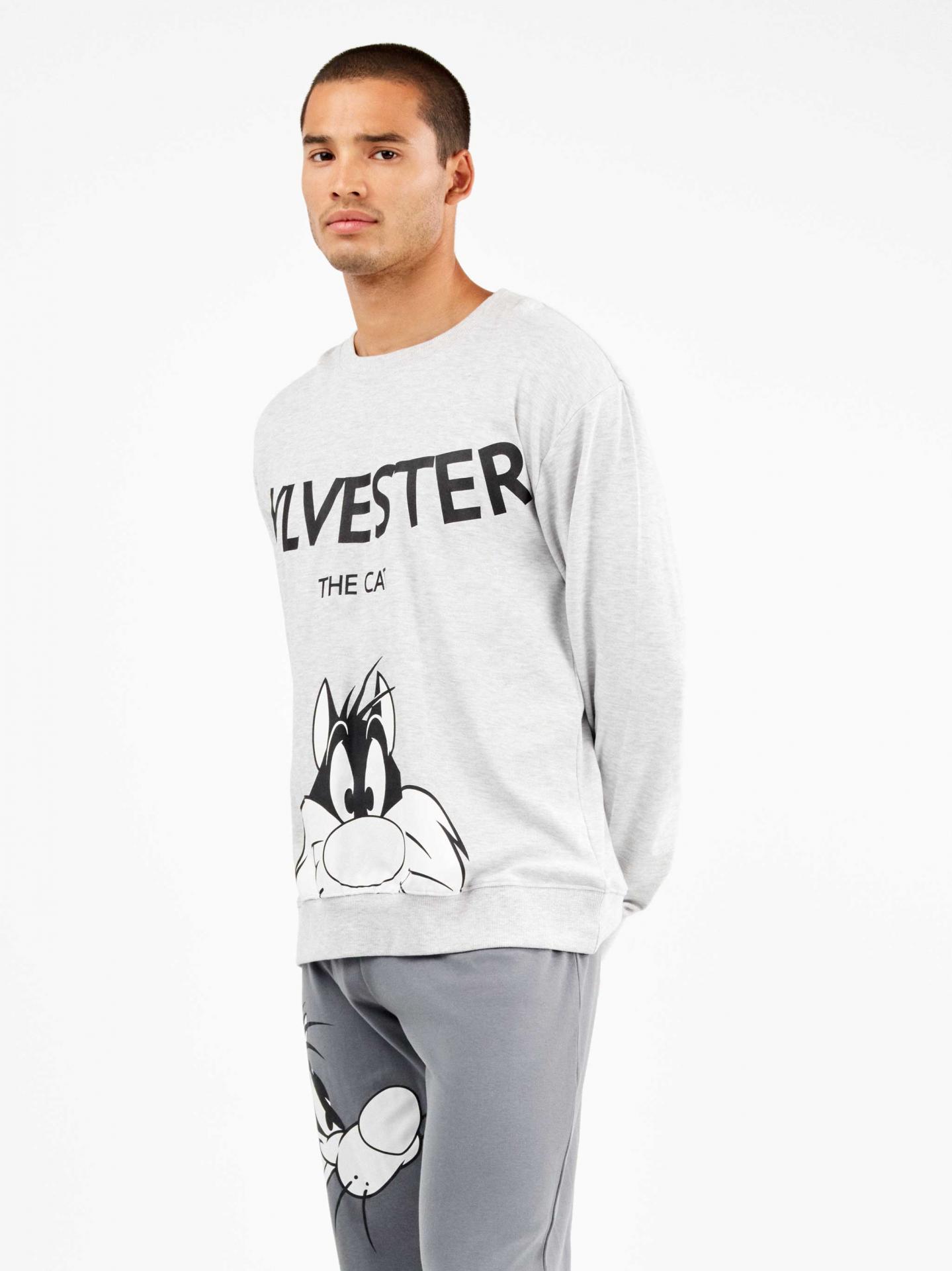 Conjunto pijama en punto interlock compuesto por una sudadera oversize con detalle posicionado Sylvester delantero, rib en mangas y cintura y pantalón en punto interlock gris marengo con elástico en cintura, detalle posicionado Sylvester el gato en el lateral y elástico en bajo.