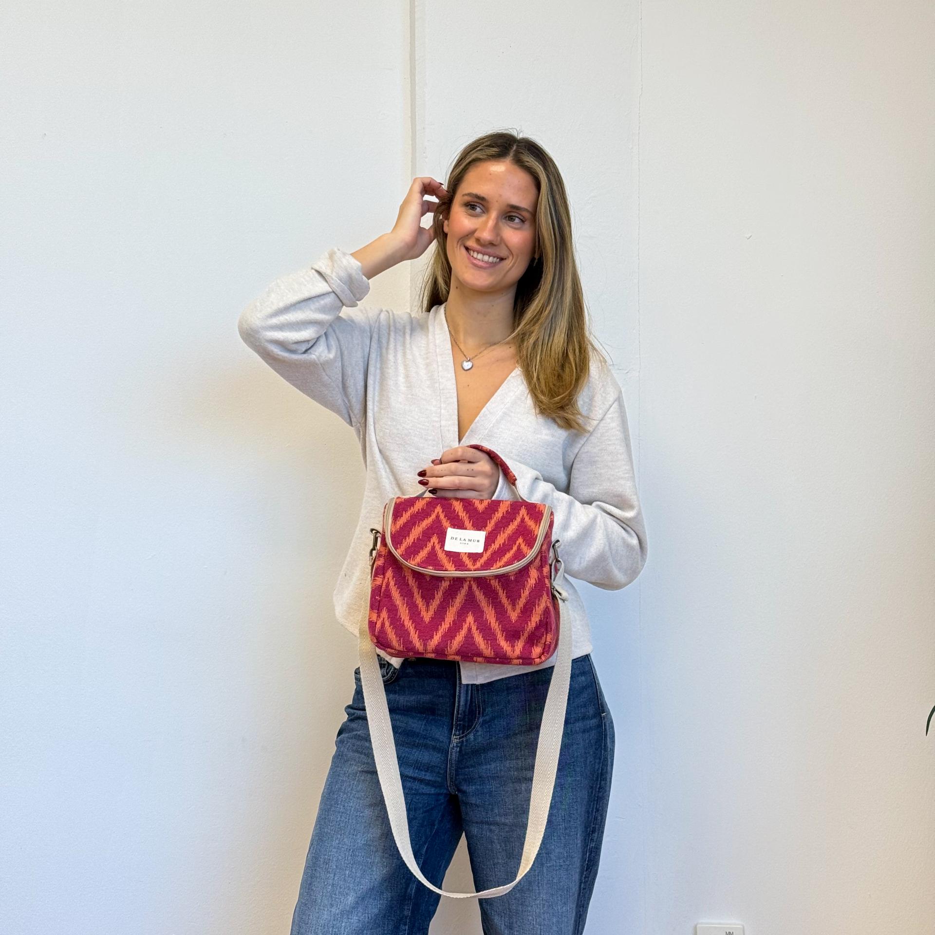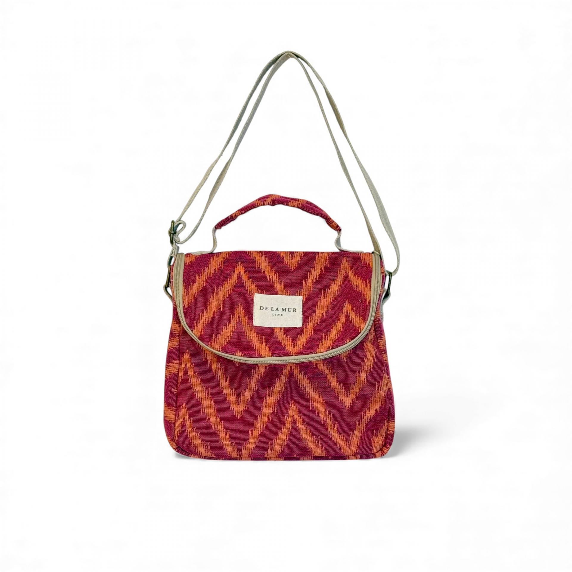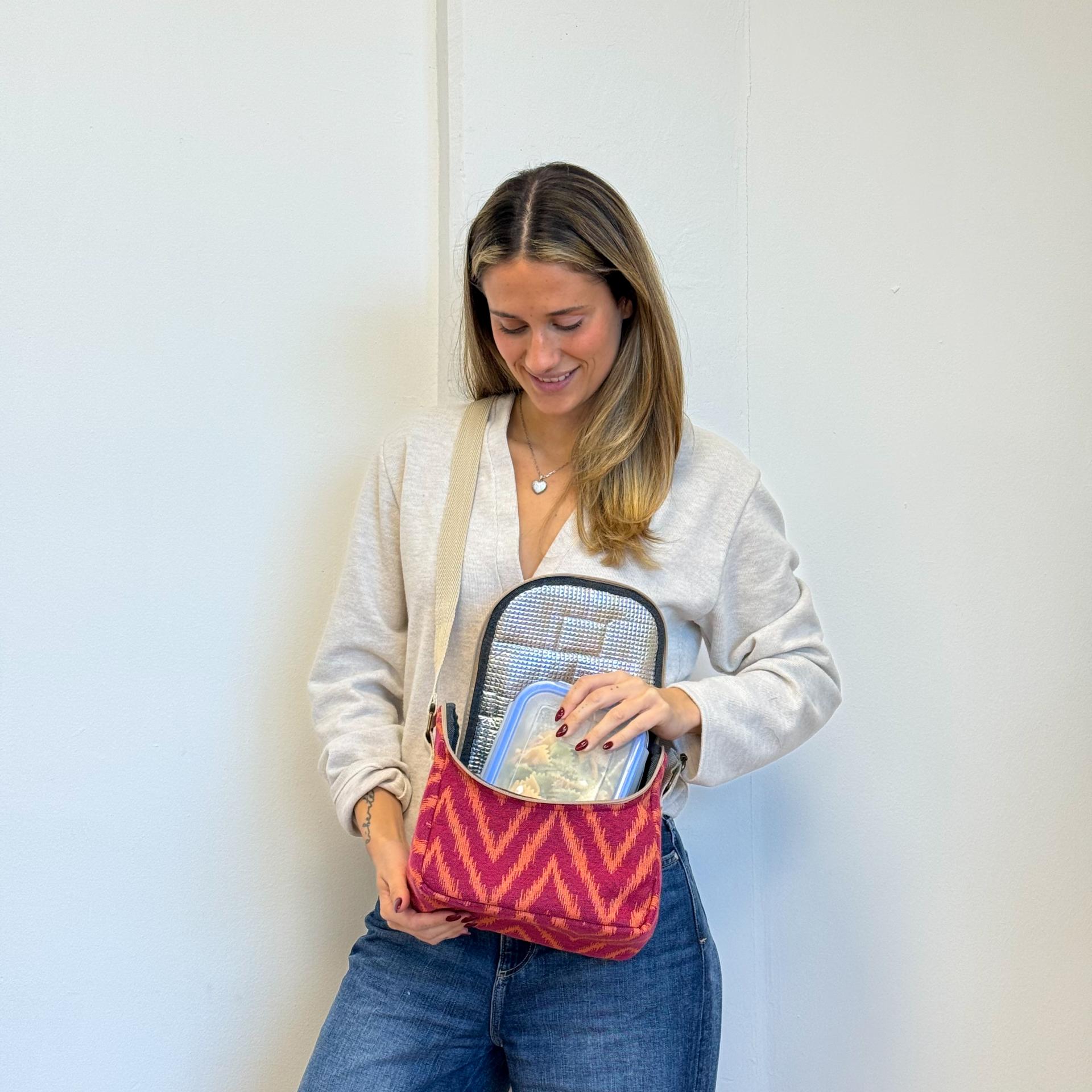 Bolso porta alimentos. Con un tejido grueso de jacquard 80% algodón y 20% poliéster con estampado tipo zigzag en tono rosa fucsia y naranja en el exterior y capa de material térmico aislante para mantener temperatura en el interior. Con asa para llevar en la mano y asa de cinta de algodón de color beige regulable para llevar cruzado. Para su correcto mantenimiento se aconseja lavarlo en frío y no utilizar secadora.