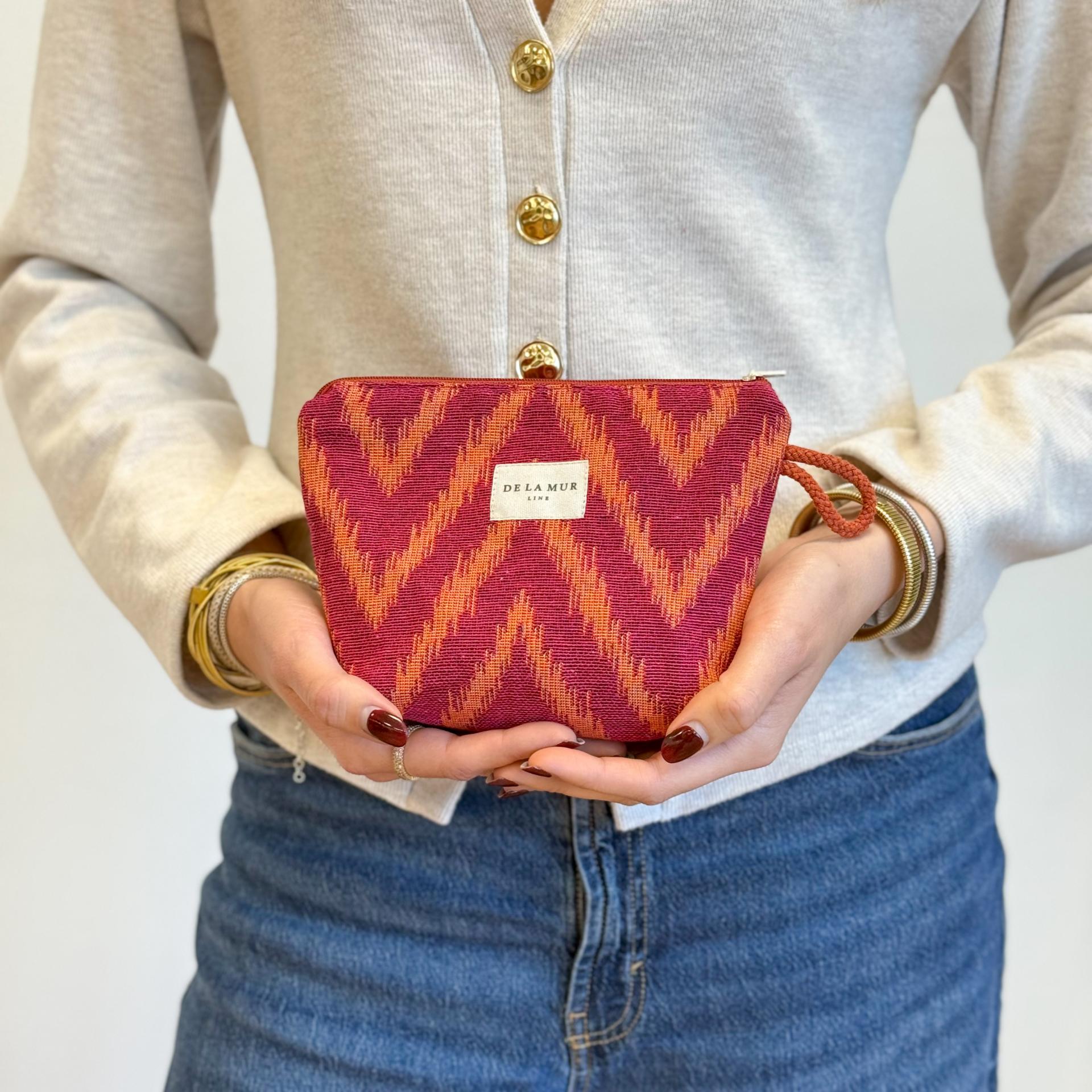 Neceser pequeño con cremallera en la parte superior y con asa lateral de cordón de color teja. Con tejido grueso de jacquard 80% algodón y 20% poliéster con estampado tipo zigzag en tonos rosa fucsia y naranja. Cada articulo puede tener una variación en el estampado, dependiendo de donde se haya efectuado el corte de la pieza. Para su correcto mantenimiento se aconseja lavarlo en frío y no utilizar secadora.