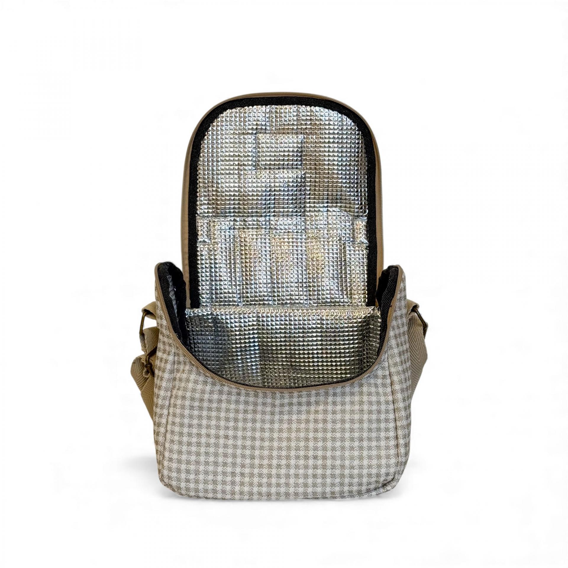Bolso porta alimentos. Con un tejido grueso de jacquard 80% algodón y 20% poliéster con estampado a cuadros vichy en tonos beige y crudo en el exterior y capa de material térmico aislante para mantener temperatura en el interior. Con asa para llevar en la mano y asa de cinta de algodón de color beige regulable para llevar cruzado. Para su correcto mantenimiento se aconseja lavarlo en frío y no utilizar secadora.