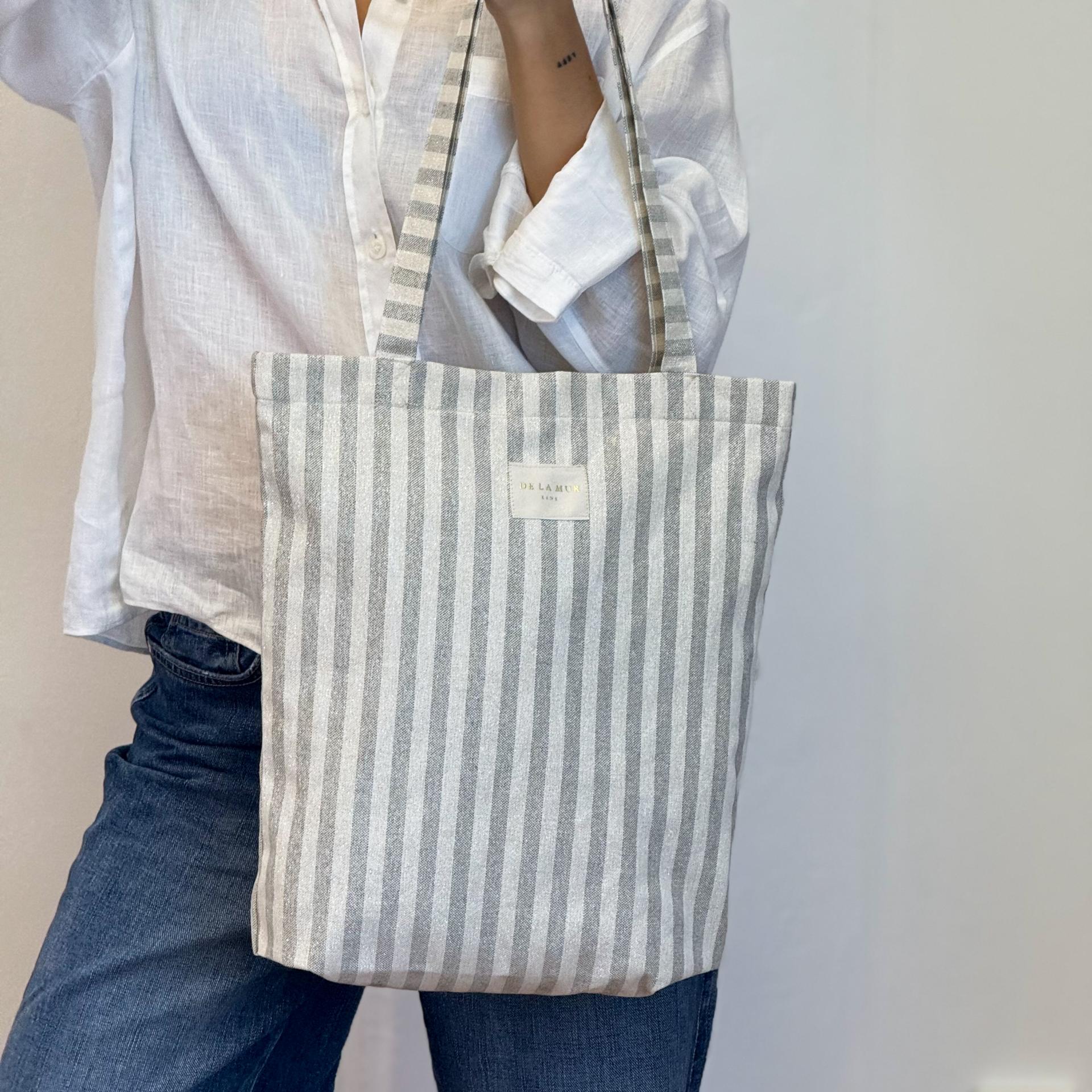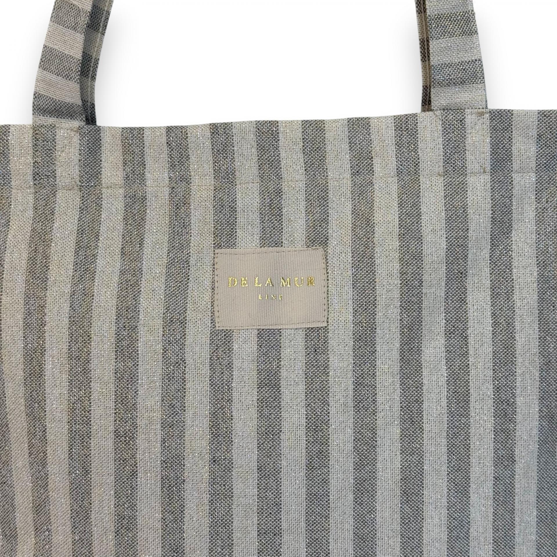 Bolsa "tote bag" con asas para llevar al hombro. Con tejido fino de half-panama 80% algodón y 20% poliéster con estampado a rayas de color gris con lurex. Etiqueta de marca con lurex dorado. Con cremallera en la parte superior. Para su correcto mantenimiento se aconseja lavarlo en frío y no utilizar secadora.