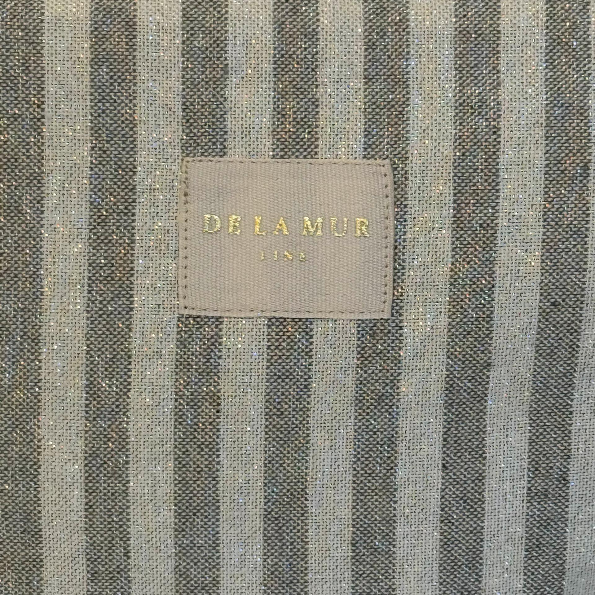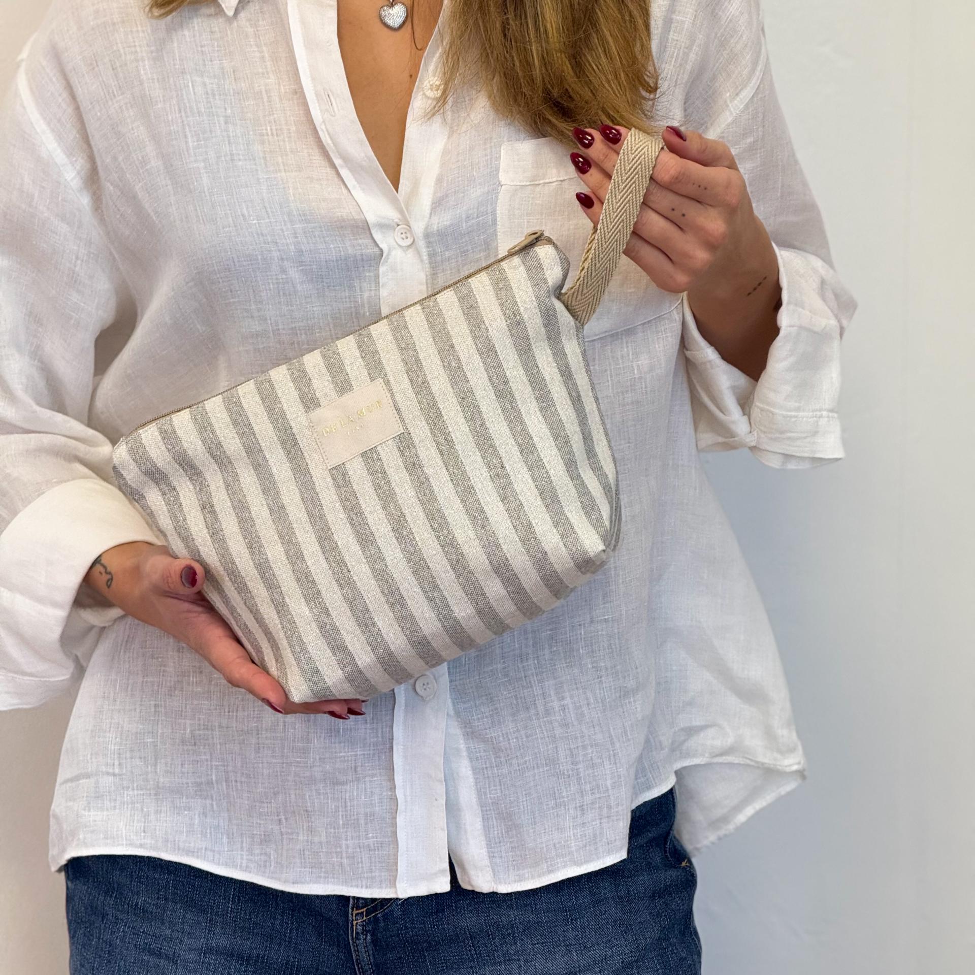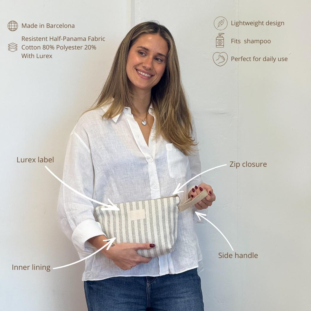 Neceser con cremallera en la parte superior y asa de cinta de color beige en el lateral. Con tejido fino de half-panama 80% algodón y 20% poliéster con estampado a rayas en tono crudo y gris con lurex. Etiqueta de marca con lurex dorado. Forrado de tejido grueso de color gris en la parte interior. Para su correcto mantenimiento se aconseja lavarlo en frío y no utilizar secadora.