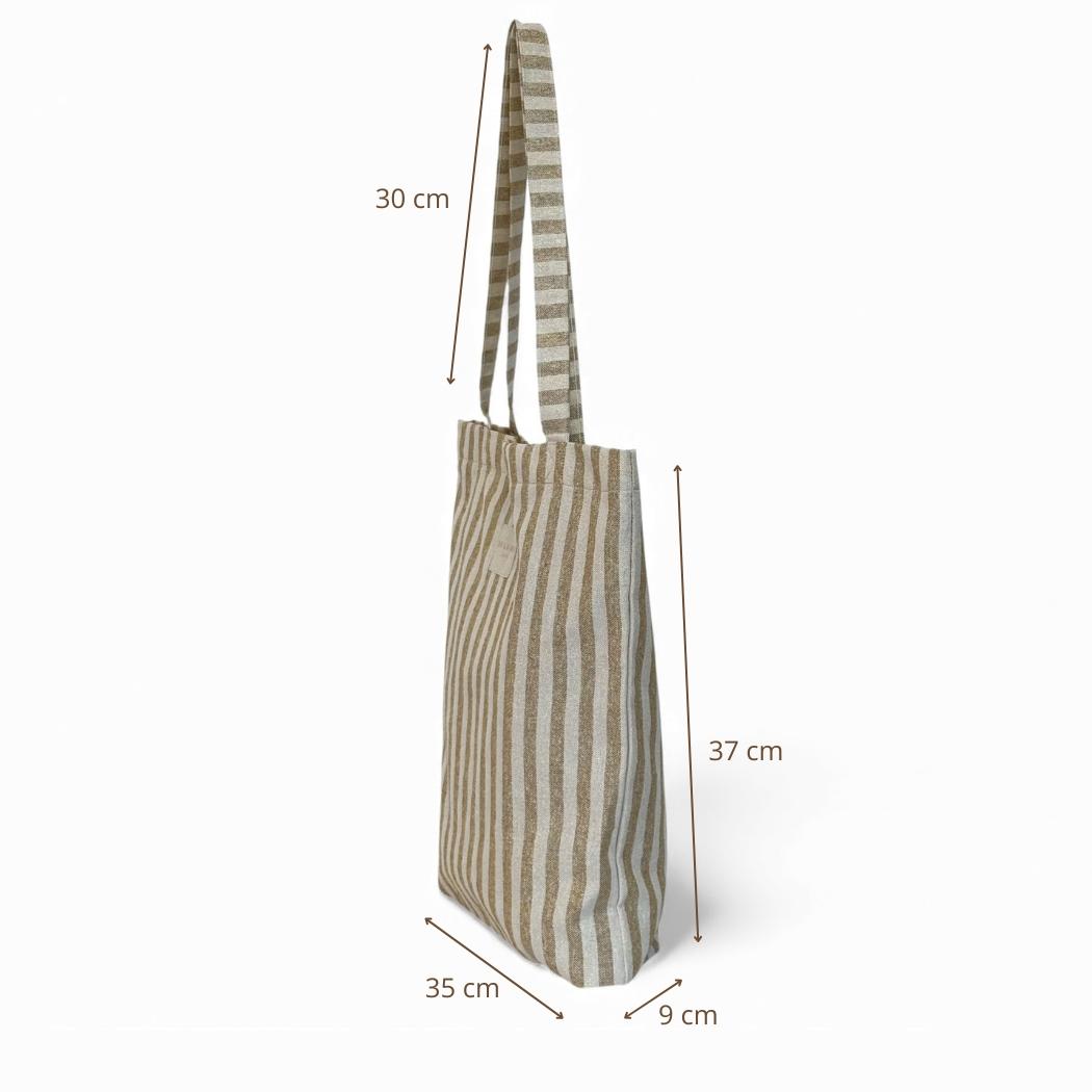 Bolsa "tote bag" con asas para llevar al hombro. Con tejido fino de half-panama 80% algodón y 20% poliéster con estampado a rayas de color mostaza con lurex. Etiqueta de marca con lurex dorado. Con cremallera en la parte superior. Para su correcto mantenimiento se aconseja lavarlo en frío y no utilizar secadora.