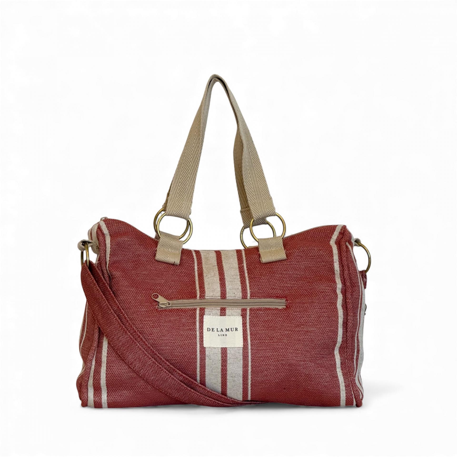 Bolso mediano con asa larga ajustable y dos asas medianas en la parte superior de cinta de espiga de algodón de color beige. Con un tejido grueso de jacquard 80% algodón y 20% poliéster con raya vertical central en color crudo sobre fondo teja. Cierre superior con cremallera. Forrado con tejido grueso de color gris oscuro en la parte interior. Bolsillo interior con cremallera. Opción de llevarlo al hombro o como bandolera. Para su correcto mantenimiento se aconseja lavarlo en frío y no utilizar secadora.