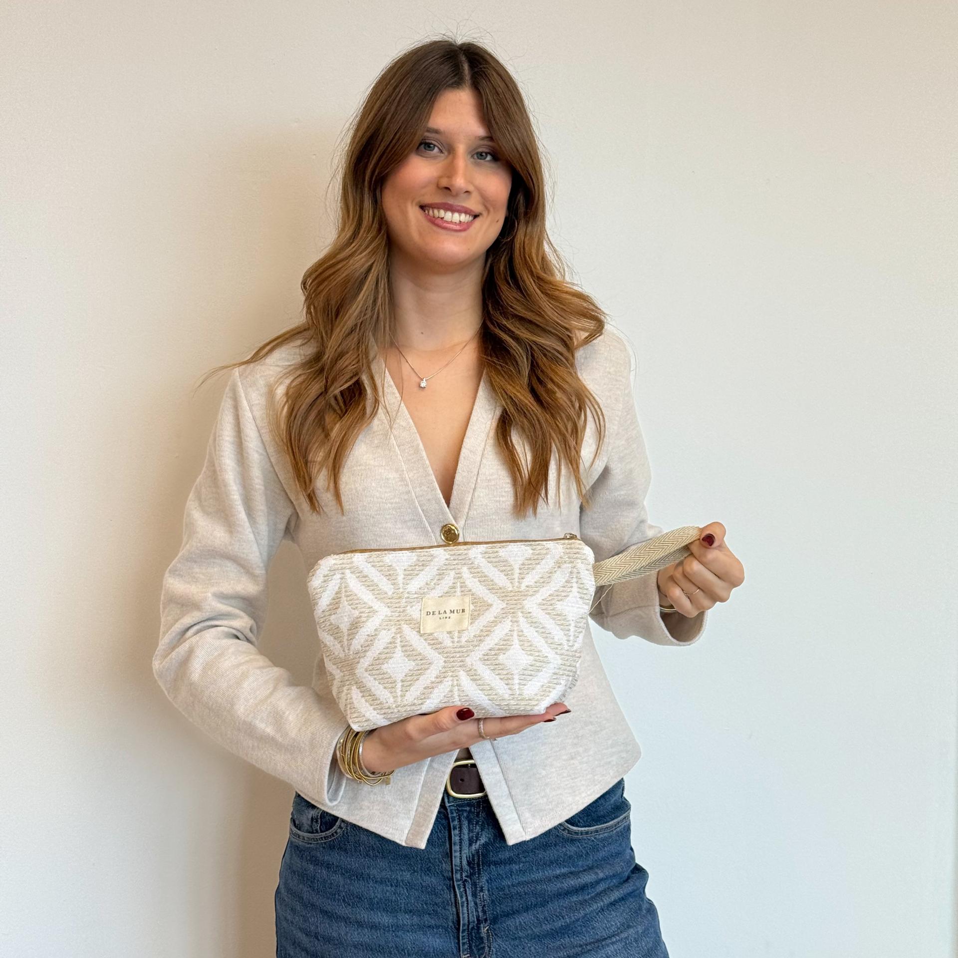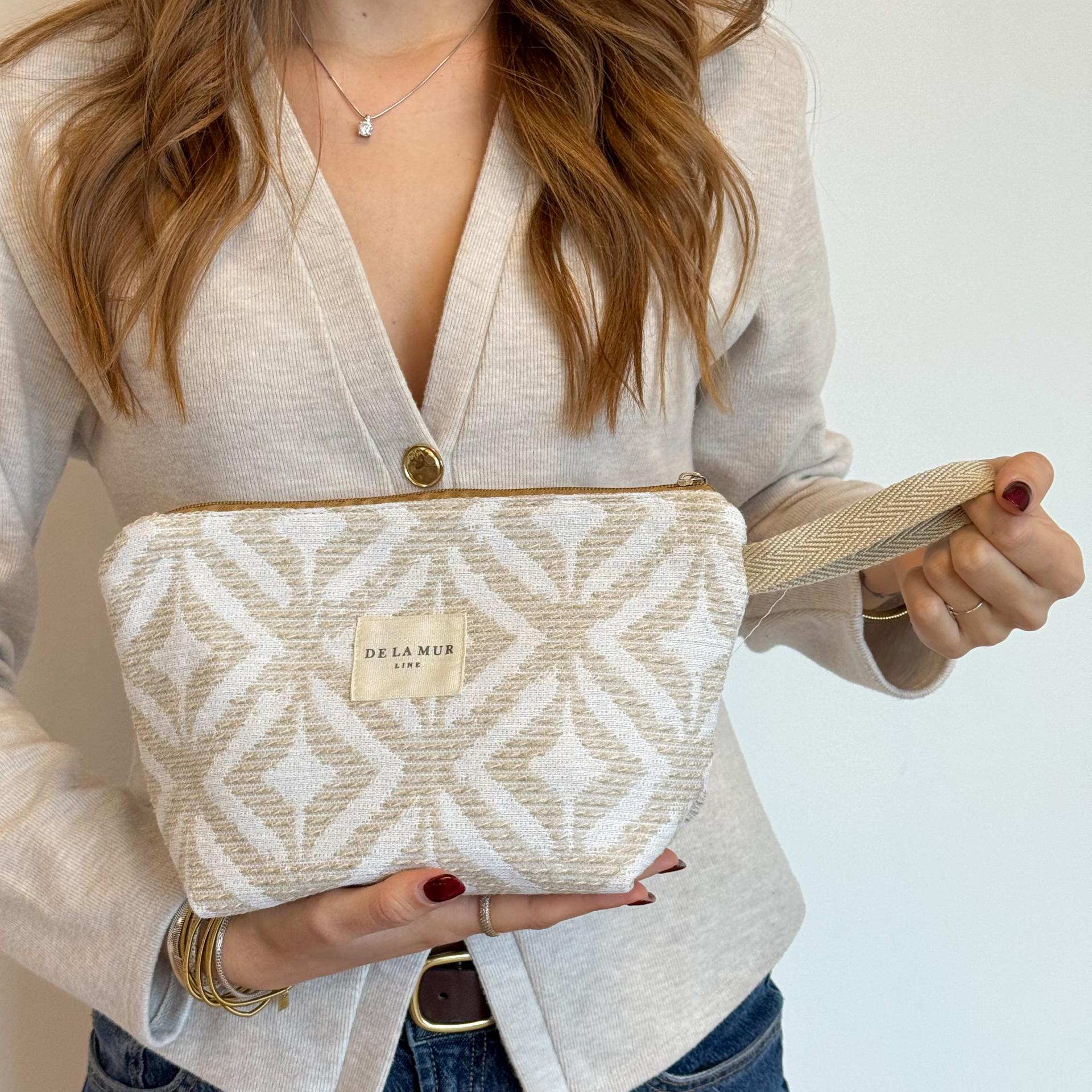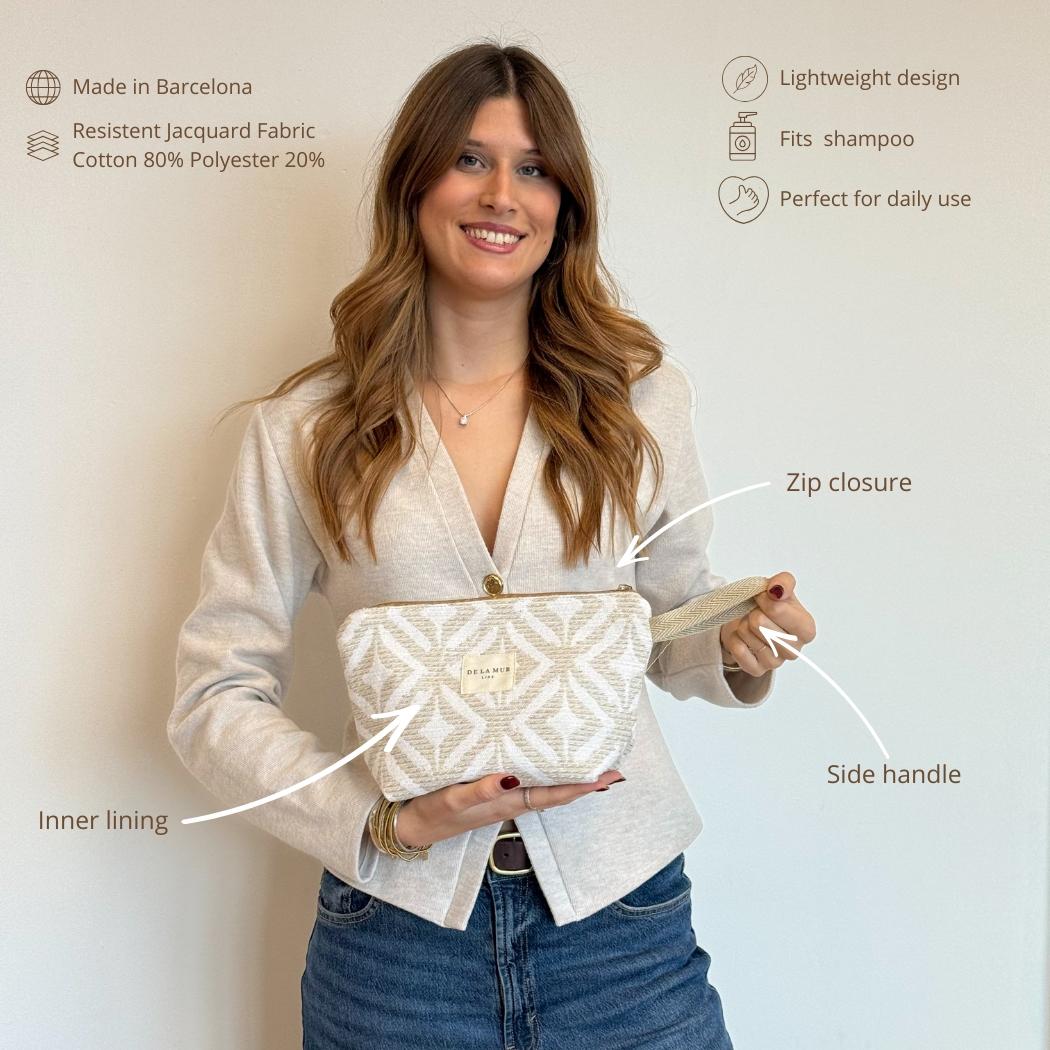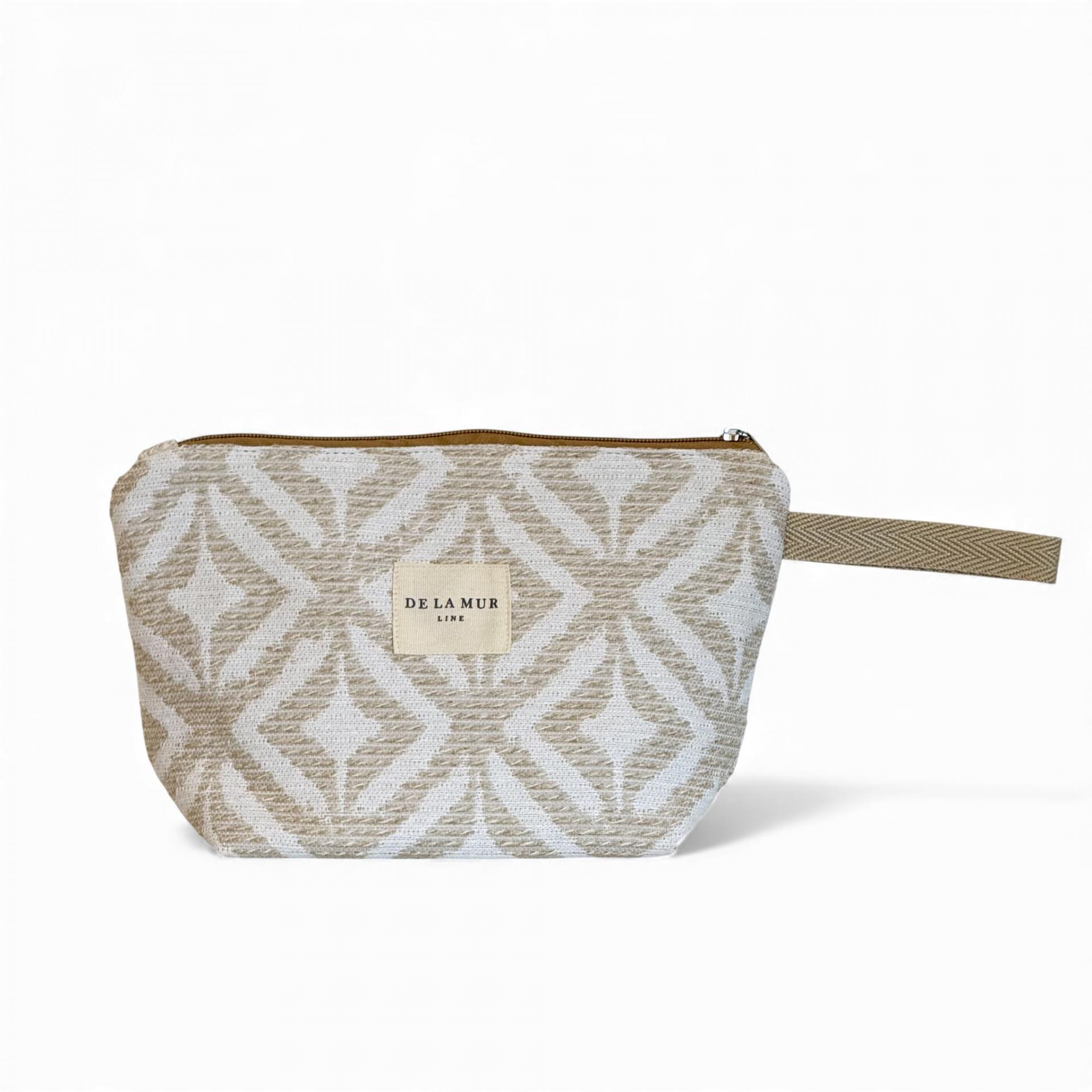 Neceser con cremallera en la parte superior y asa de cordón de color beige en el lateral. Con tejido grueso de jacquard 80% algodón y 20% poliéster con estampado geométrico en tonos beige y crudo. Forrado de tejido grueso de color gris en la parte interior. Para su correcto mantenimiento se aconseja lavarlo en frío y no utilizar secadora.