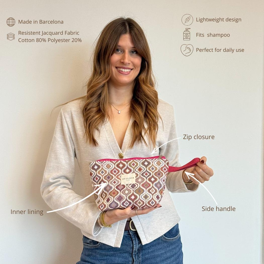 Neceser con cremallera en la parte superior y asa de cordón de color rosa en el lateral. Con tejido grueso de jacquard 80% algodón y 20% poliéster con estampado en tonos lila y rosa. Forrado de tejido grueso de color gris en la parte interior. Para su correcto mantenimiento se aconseja lavarlo en frío y no utilizar secadora.