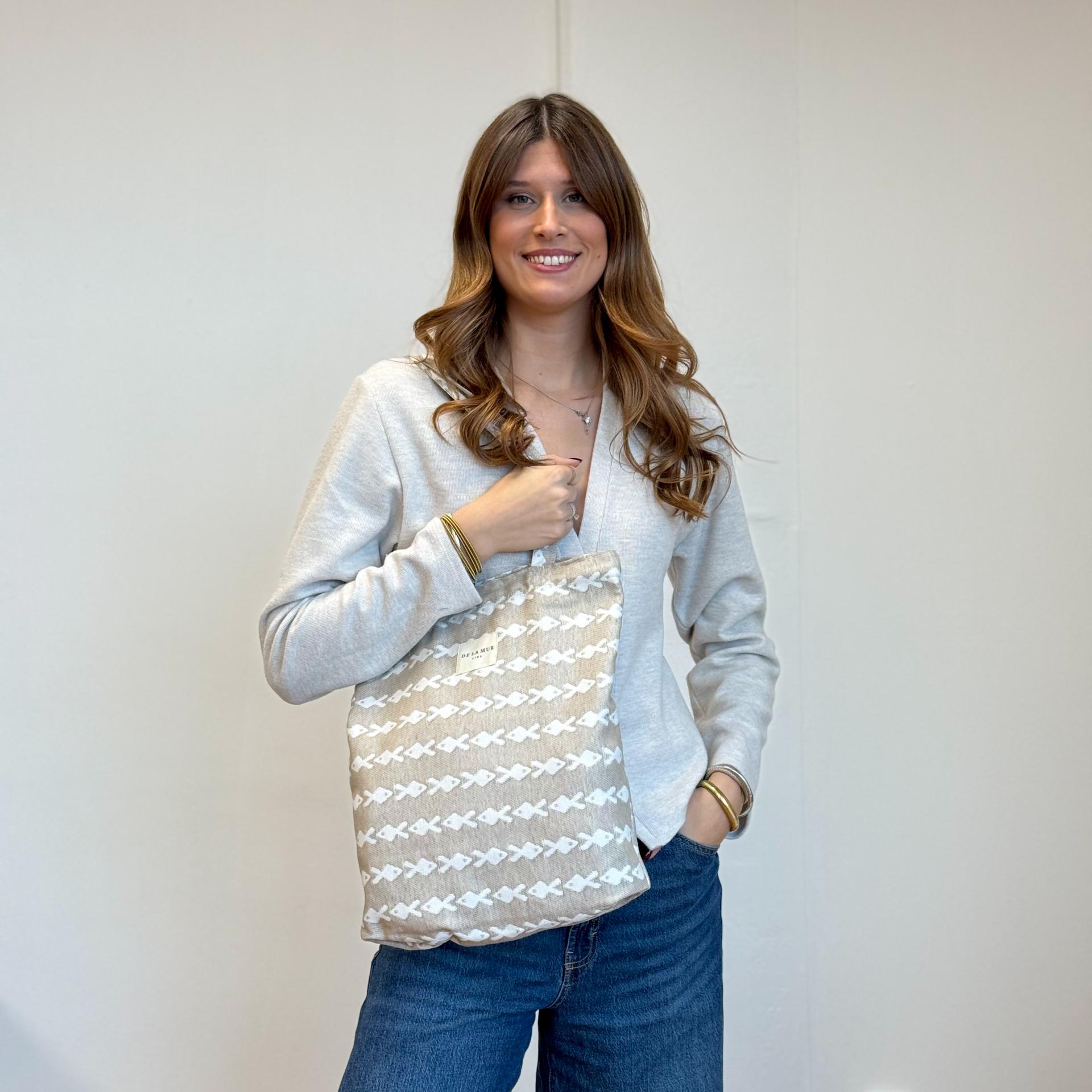 Bolsa "tote bag" con asas para llevar al hombro. Con tejido grueso de jacquard 80% algodón y 20% poliéster con estampado de peces de color crudo sobre fondo beige. Con cremallera en la parte superior. Para su correcto mantenimiento se aconseja lavarlo en frío y no utilizar secadora.