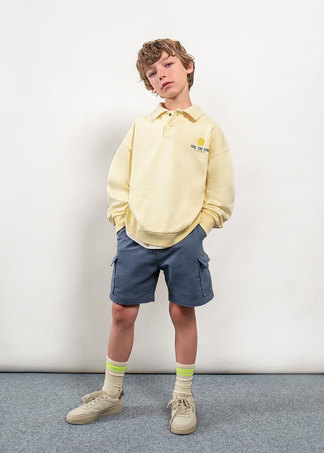 Pantalón largo para niño con fitting chino cargo, un diseño que combina el estilo clásico del pantalón chino con el toque funcional de los bolsillos cargo. Cintura ajustable con goma interior y botones para mayor comodidad. Cierre con cremallera y botón. Bolsillos laterales tipo cargo y bolsillos traseros. Por motivos de seguridad, las tallas pequeñas (2-5 años) llevan una bragueta simulada sin cremallera.