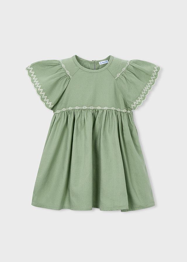 Vestido con detalles bordados para niña. Diseño con cintura elástica y bajo amplio. Cierre trasero con botón. Disponible en la talla desde los 2 a los 10 años.