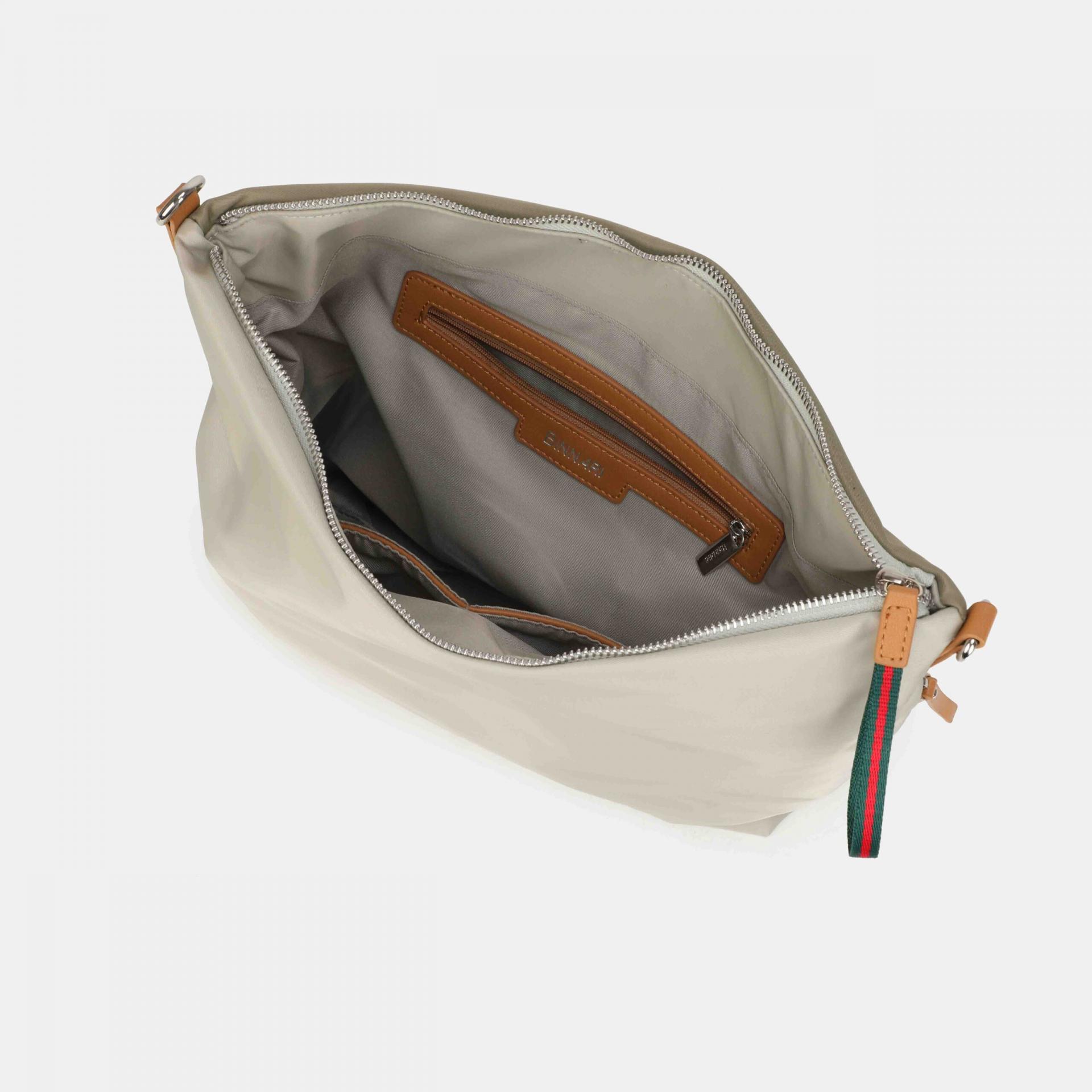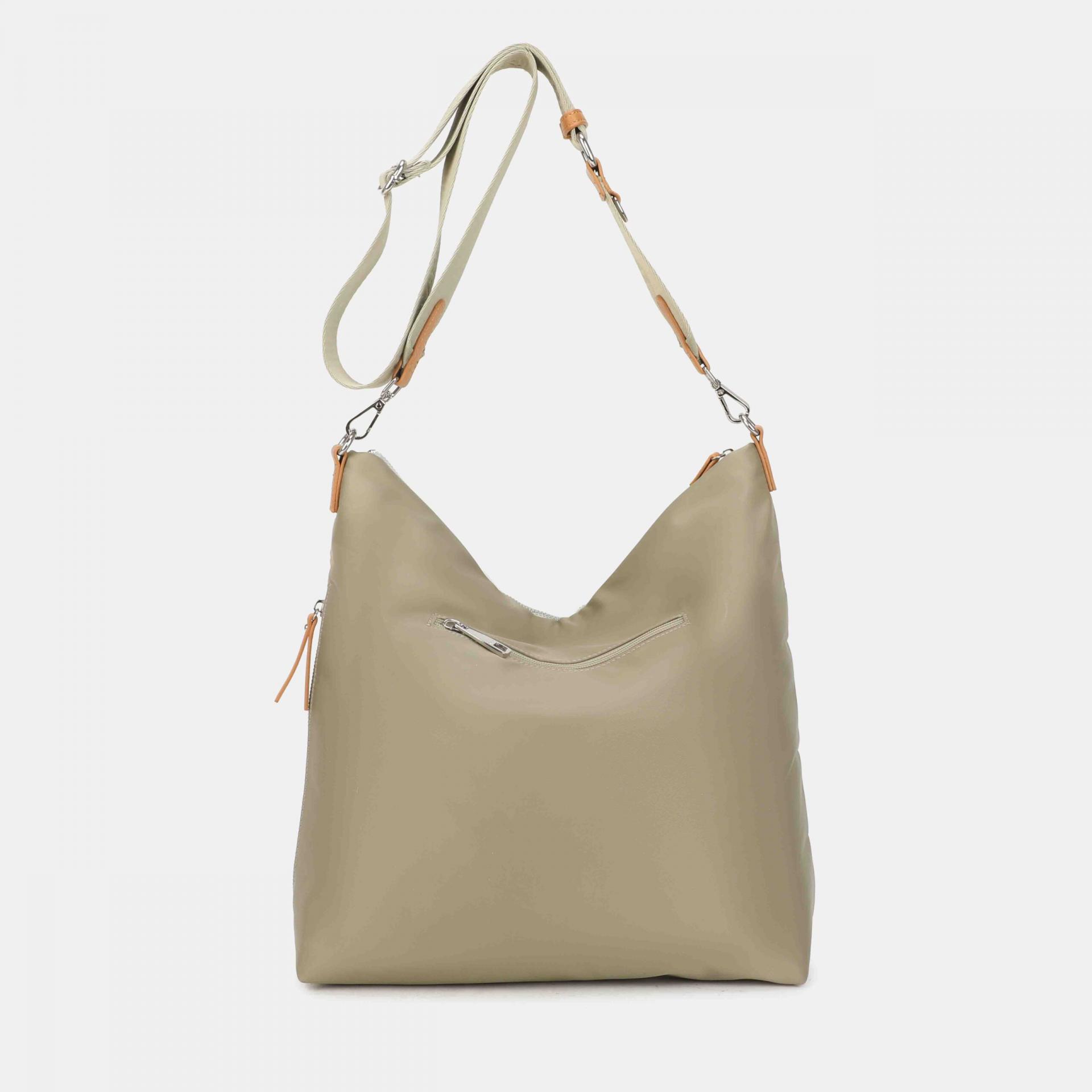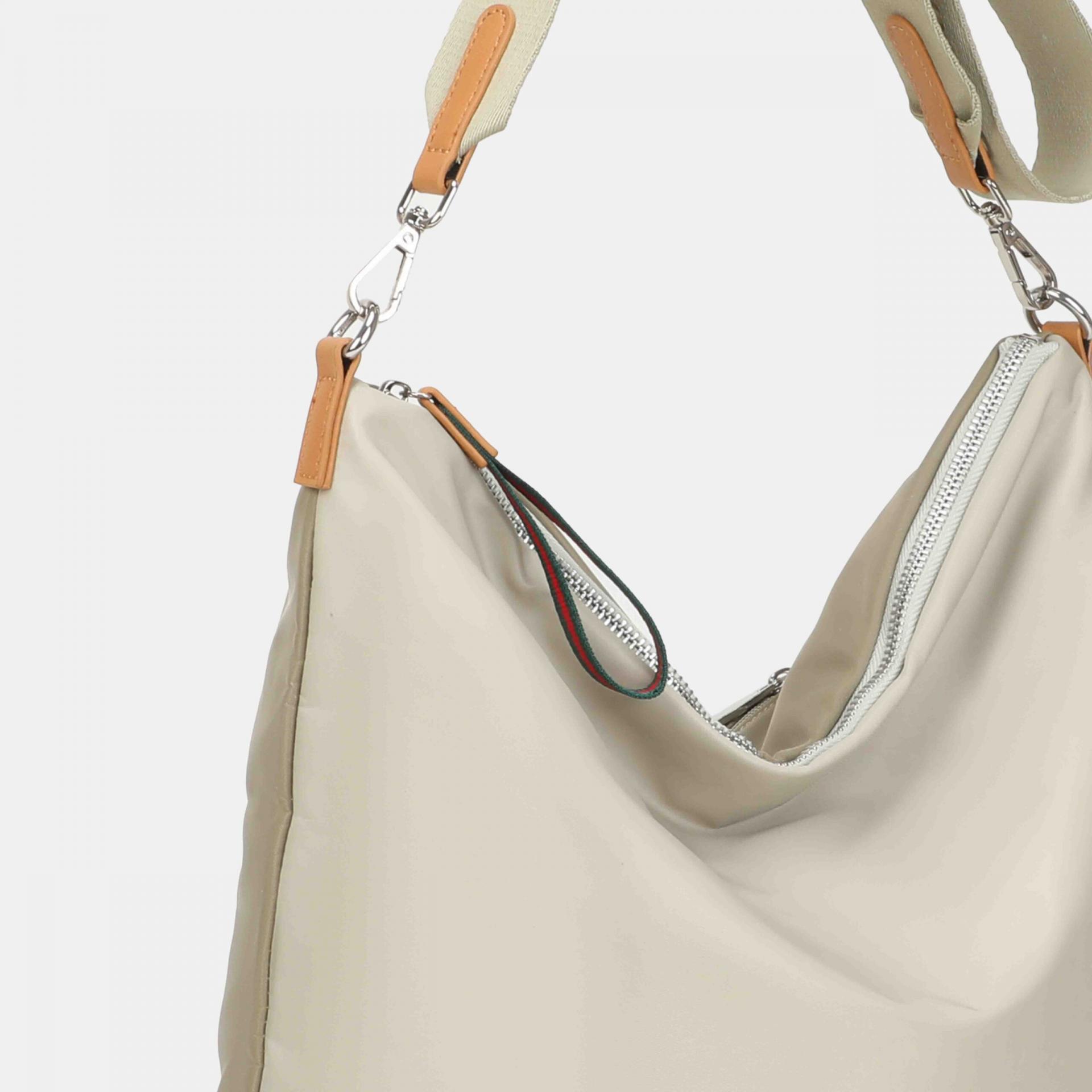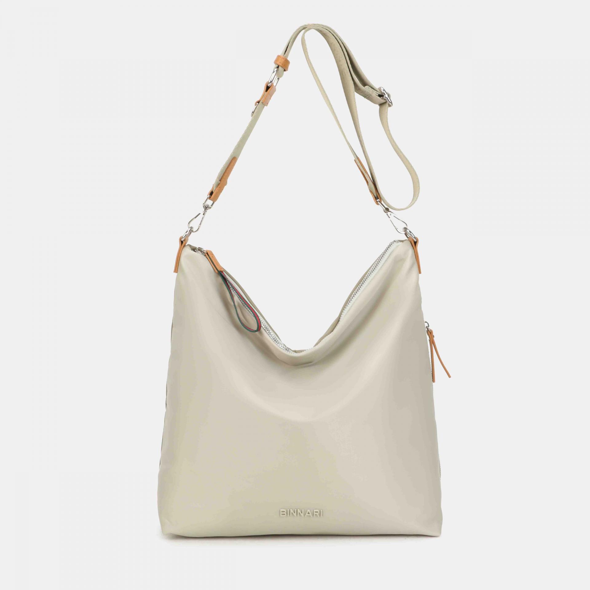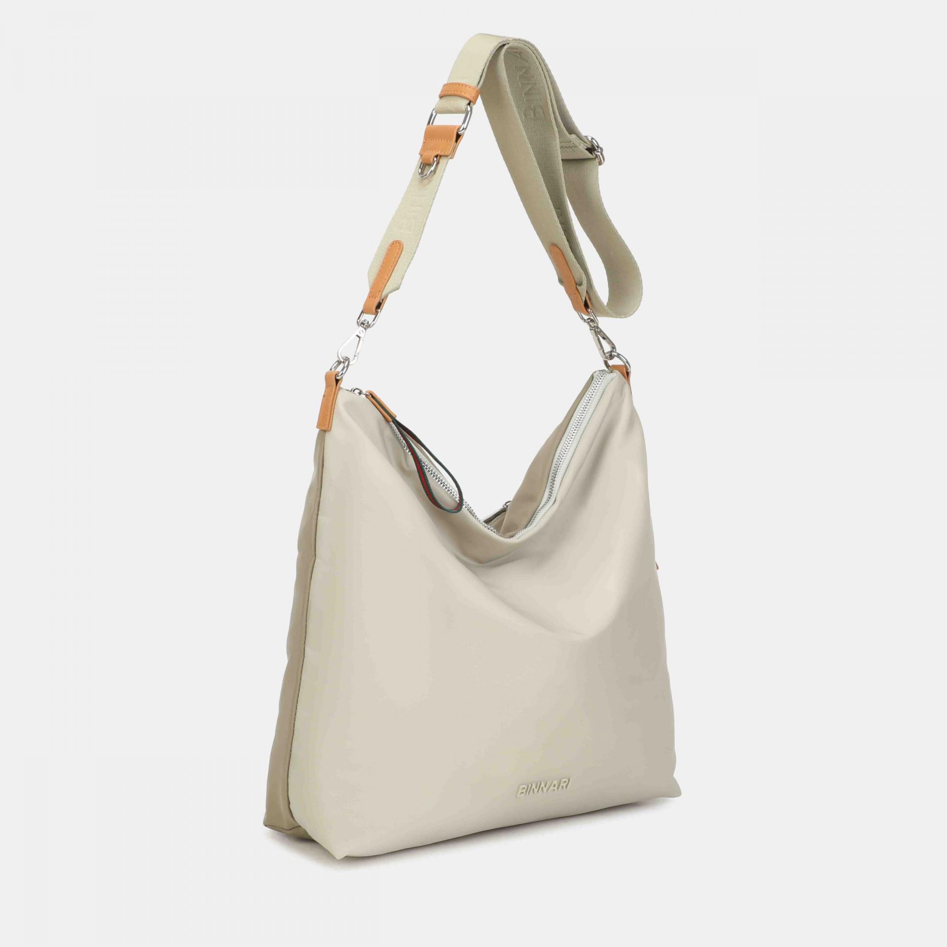 Bolso de hombro Hiedra confeccionado en nylon reciclado y detalles en PU. En la parte delantera tiene el logo Binnari tonal.Se accede a su interior por medio de una cremallera superior. Dos posiones: hombro y bandolera (asa ajustable). Los detalles metálicos son de color nickel.