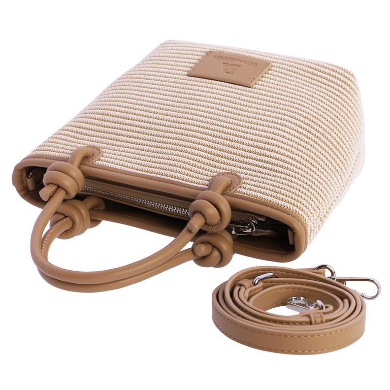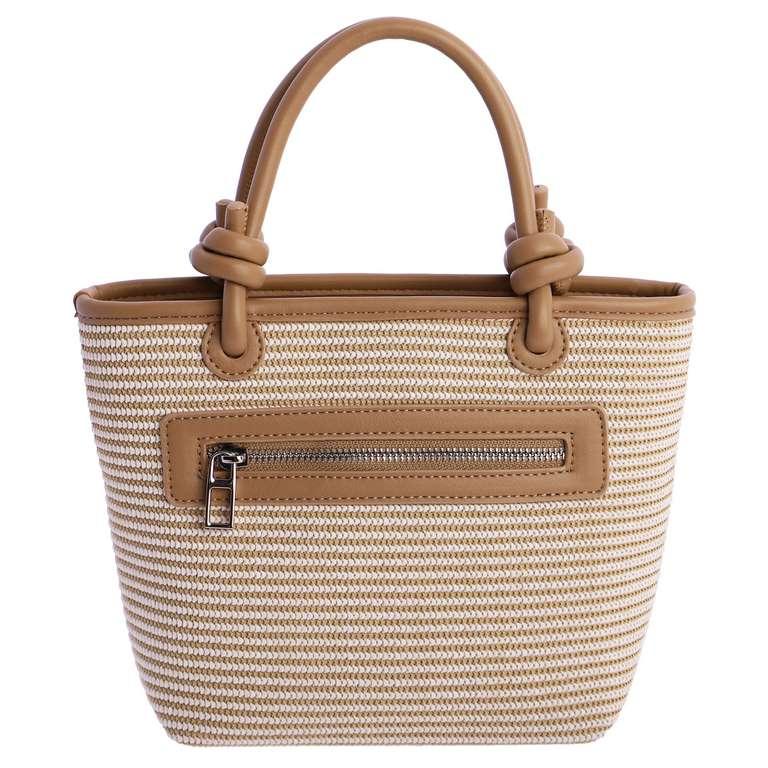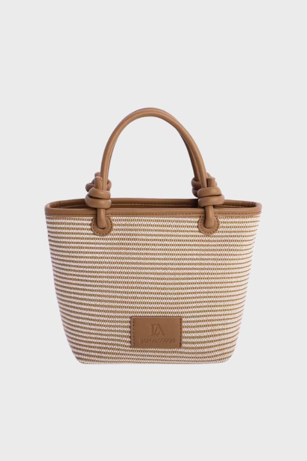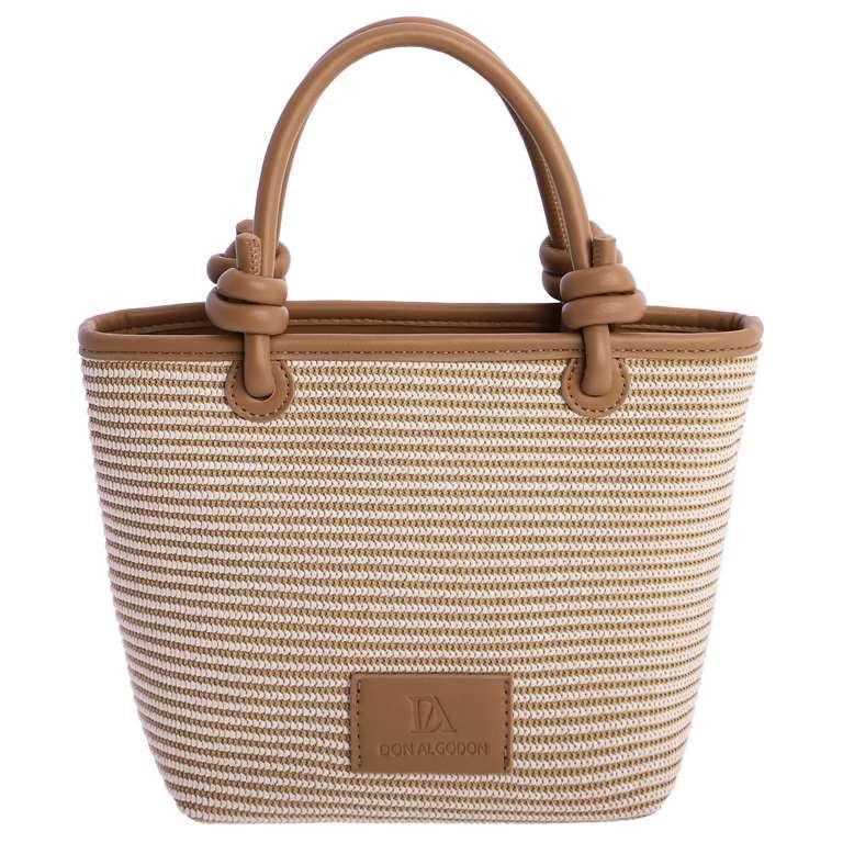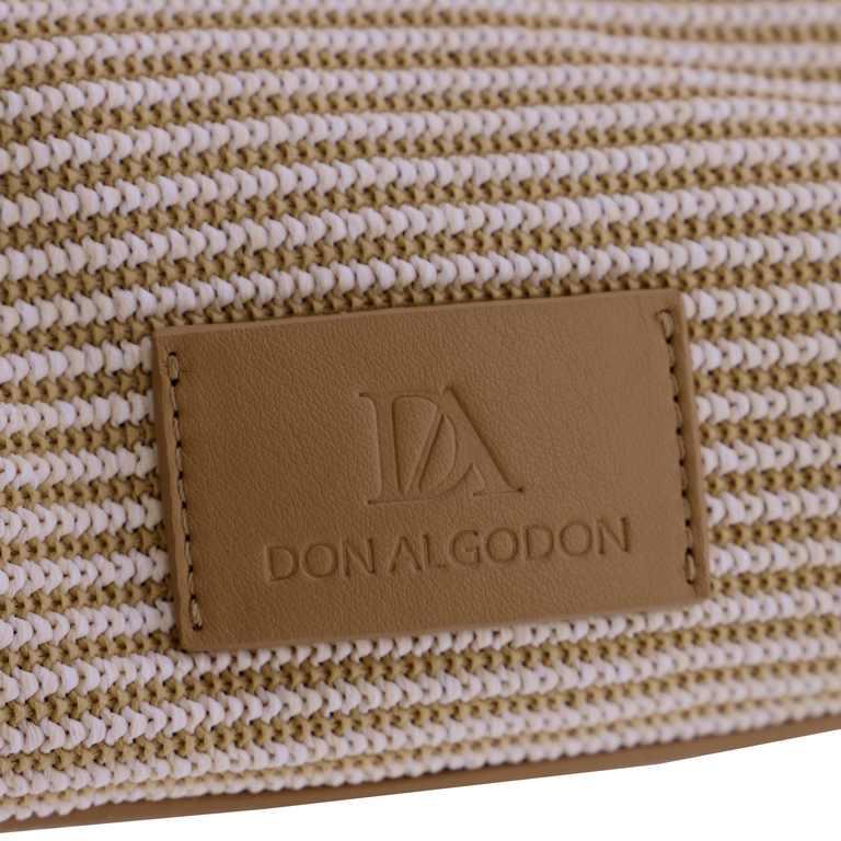 Bolso de mano de Don Algodon de fibras naturales a rayas y piel sintética con el logo en la parte frontal. Tiene cierre de cremallera.