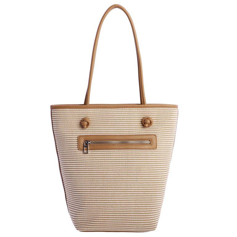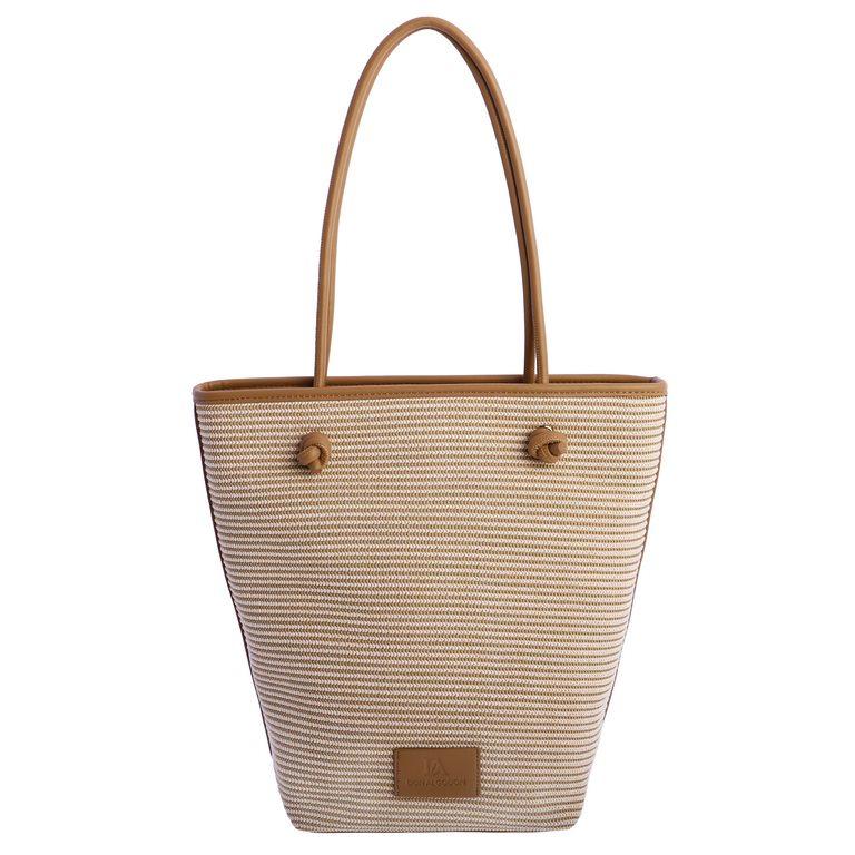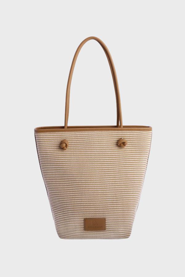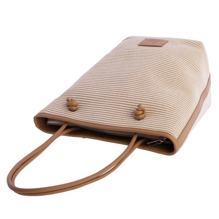 Bolso shopper de Don Algodon de fibras naturales a rayas y piel sintética con el logo en la parte frontal. Tiene cierre de cremallera.