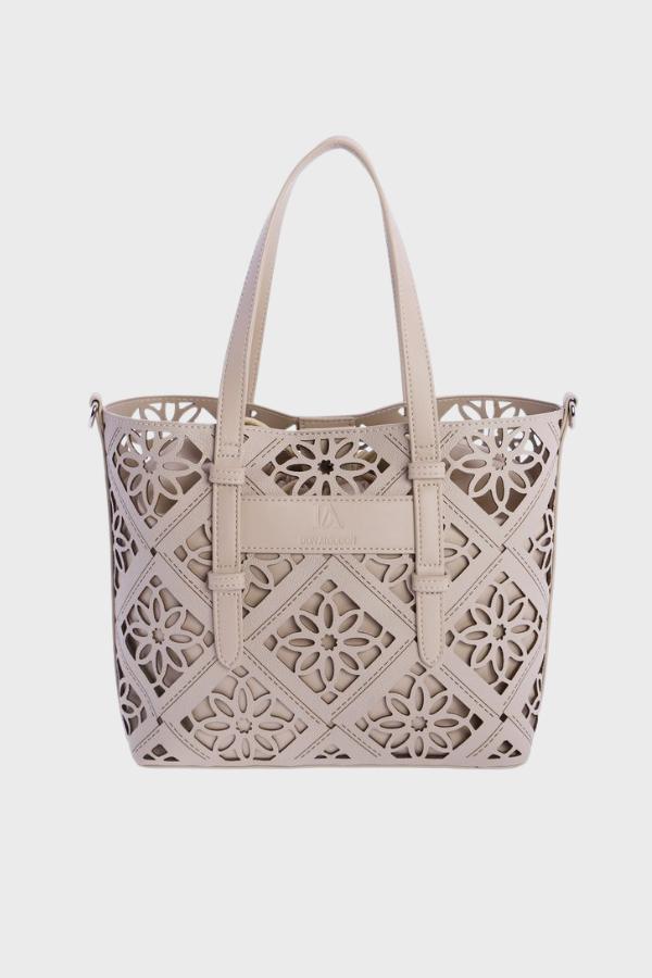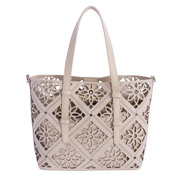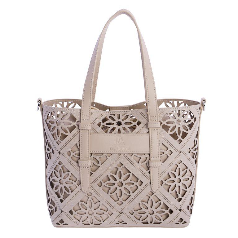 Bolso de mano Irisa de Don Algodon de piel sintética con motivos florales troquelados con el logo en la parte frontal. En su interior lleva un bolso saco independiente y un asa bandolera extraíble.