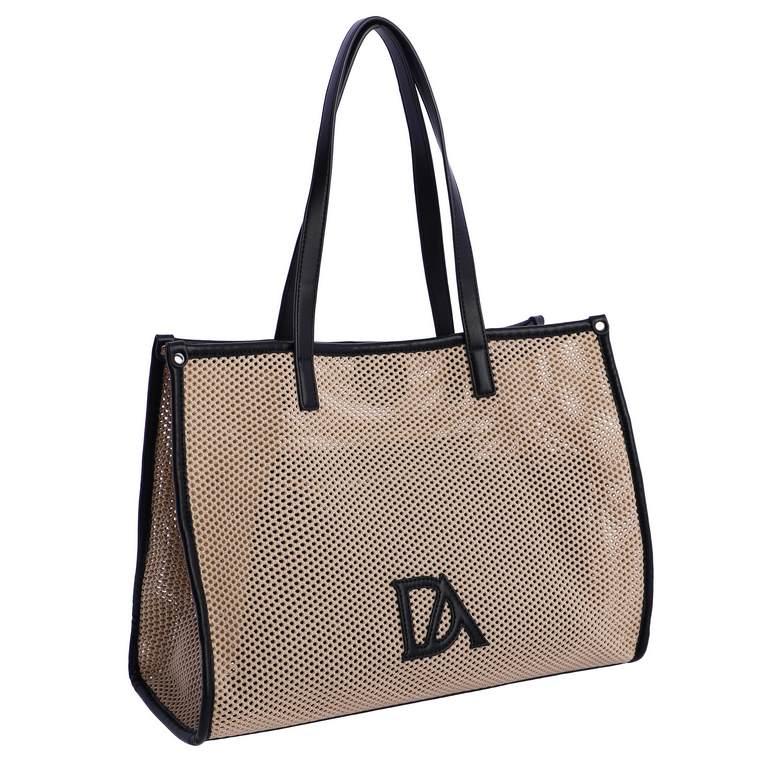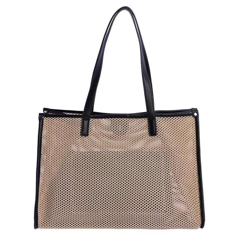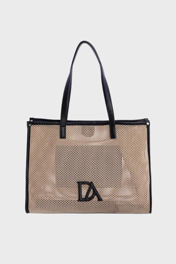Bolso shopper de Don Algodón, tela tipo rejilla en color beige y en negro. Con dos asas para llevarlo al hombro, cierre de click, y en el interior un neceser con cremallera en color negro.