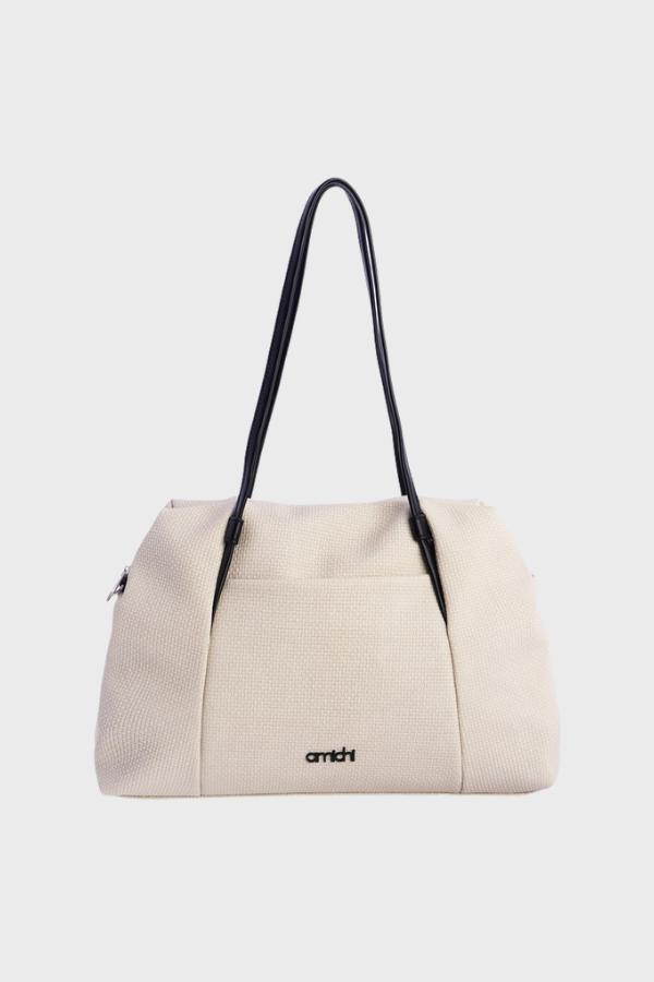 Bolso para mujer de piel sintética.Tiene cierre de cremallera. Asa en color negro como el logo de la casa Amichi, los apliques metálicos son plateados. Lleba asa bandolera.