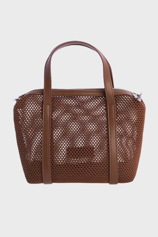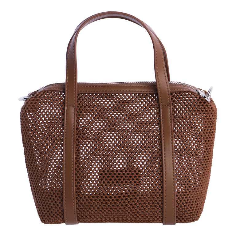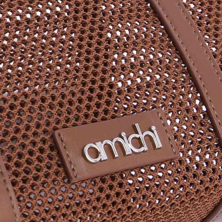 Bolso de mano de Amichi, de color marrón, con tejido tipo rejilla. Bandolera extraíble y desmontable. Dos asas para llevarlo en la mano, cierre con cremallera.