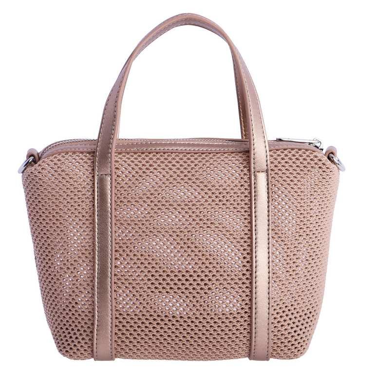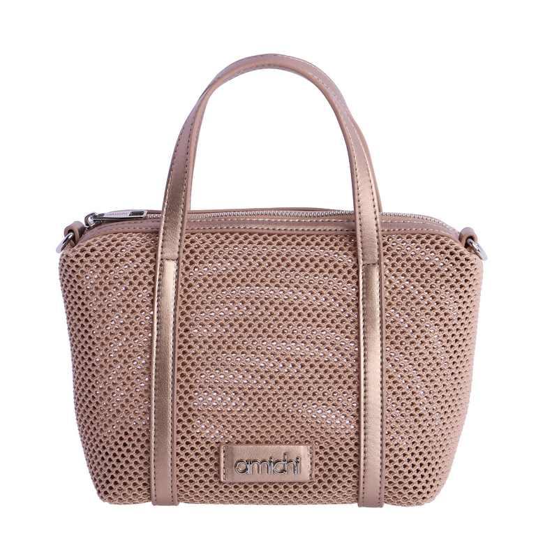 Bolso de mano de Amichi, de color plata, con tejido tipo rejilla. Bandolera extraíble y desmontable. Dos asas para llevarlo en la mano, cierre con cremallera.