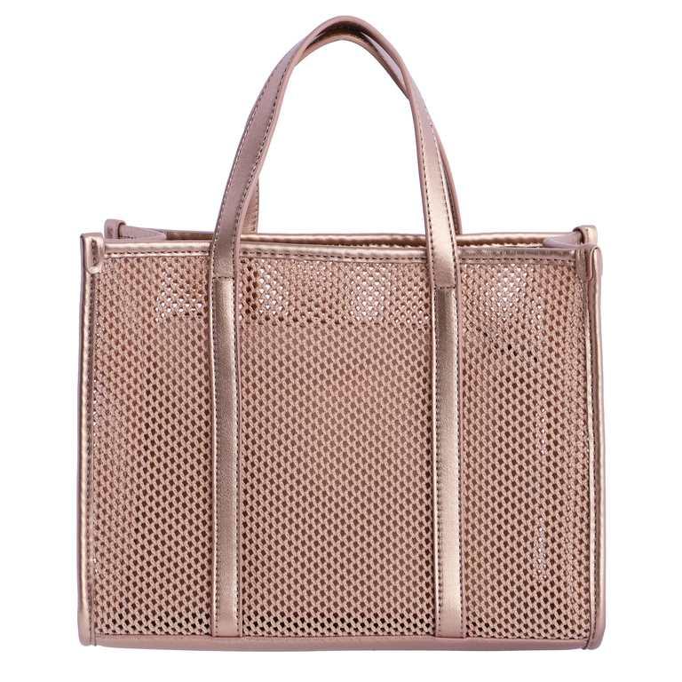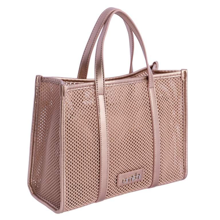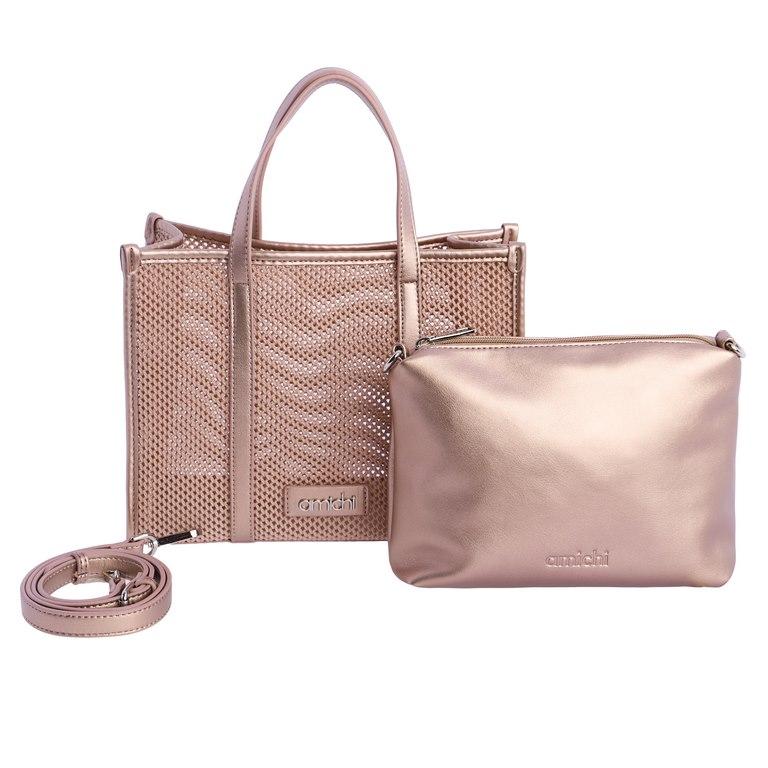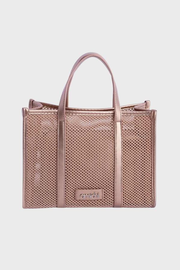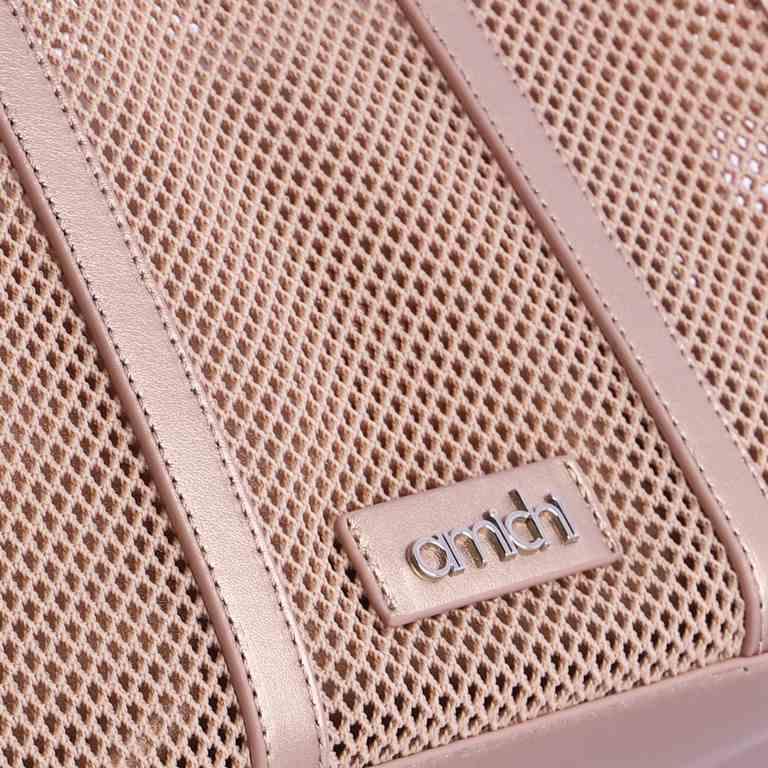 Bolso de Amichi en color marrón, con tejido tipo rejilla. Bandolera extensible y desmontable. Dos asas para llevarlo en la mano. En el interior un neceser extraíble con cierre con cremallera.