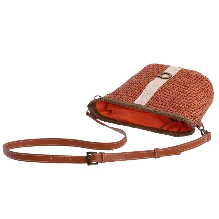Bolso bandolera para mujer Amichi de fibras naturales trenzadas. Lleva el logo de madera en el frontal. Tiene cierre de cremallera, dispone de tres bolsillos interiores, uno de ellos con cremallera. Lleva una asa bandolera extraíble y ajustable.