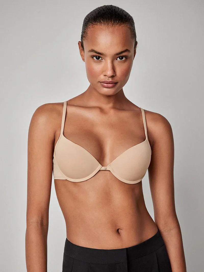 Sujetador básico en color tierra de la marca Gisela. Con aro y push up +1. Tirantes regulables que incluyen el encganche para poder cruzarlos. Cierre trasero de cuatro posiciones y detalle de botón decorativo en el centro del escote. Disponible en tres colores: blanco, piel y negro.