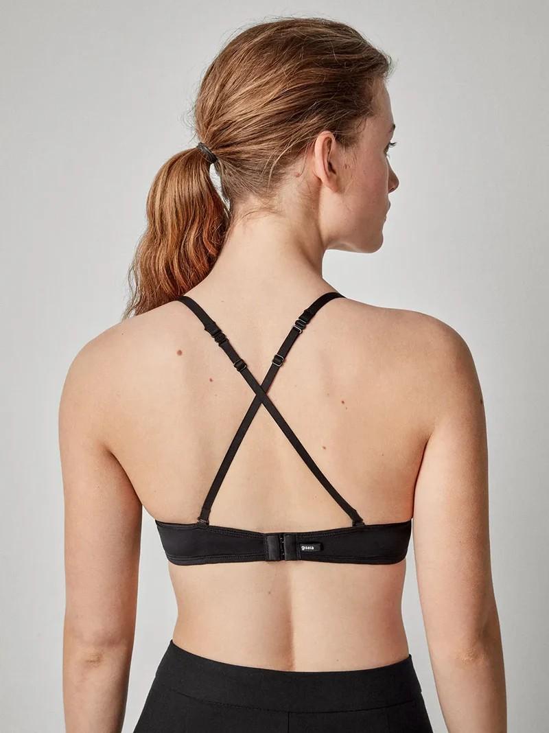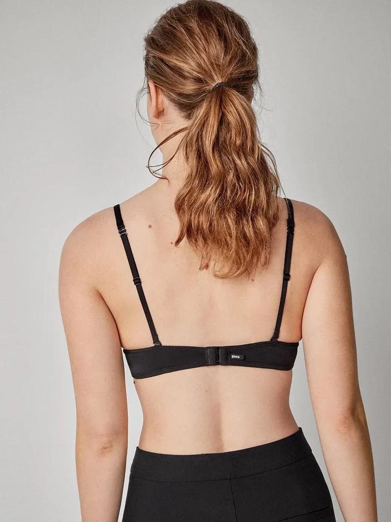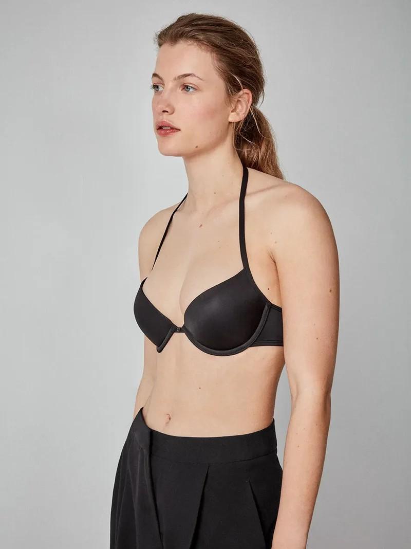 Sujetador básico en color negro de la marca Gisela. Con aro y push up +1. Tirantes regulables que incluyen el encganche para poder cruzarlos. Cierre trasero de cuatro posiciones y detalle de botón decorativo en el centro del escote. Disponible en tres colores: blanco, piel y negro.